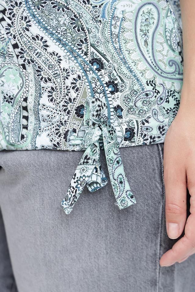 Основной цвет футболки – бирюзовый, украшен эффектным принтом пейсли в белых, серых и тёмно-синих тонах. Принт покрывает всю поверхность изделия, создавая яркий и запоминающийся образ.
