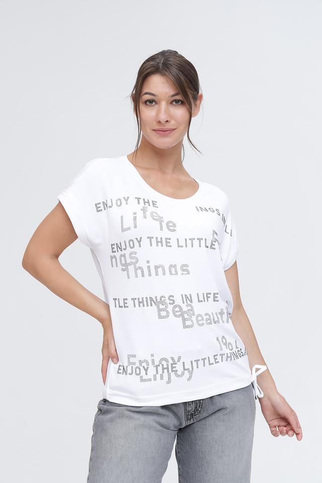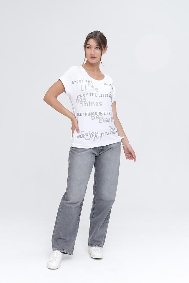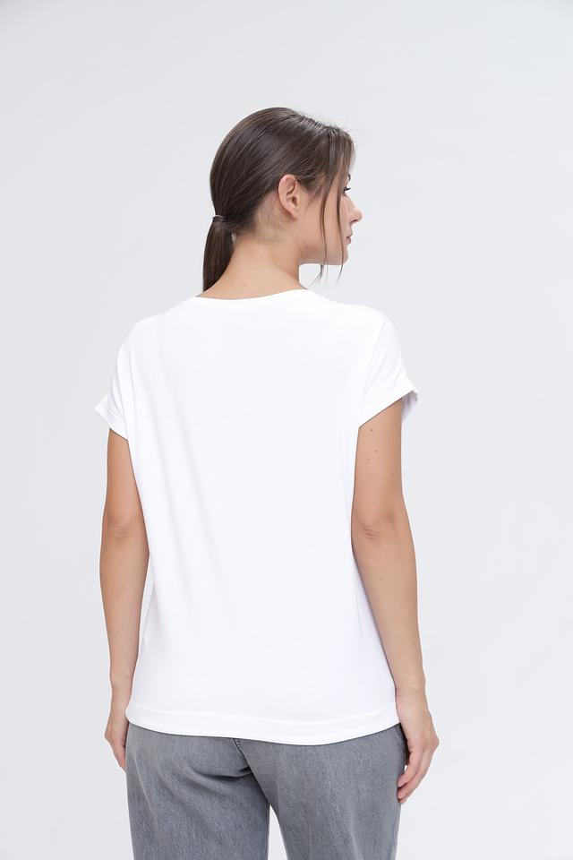 Белая футболка Monari с оригинальным принтом – стильное и комфортное решение для повседневного образа. Изготовлена из мягкого и приятного к телу сочетания модала, вискозы и эластана, обеспечивающего свободу движений. Состав: модал 45%, вискоза 45%, эластан 10%