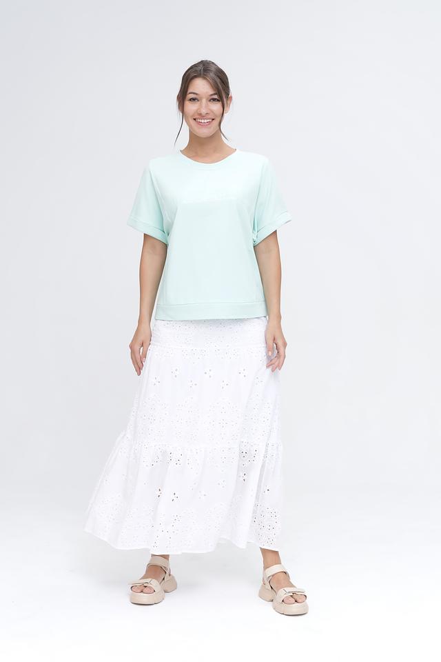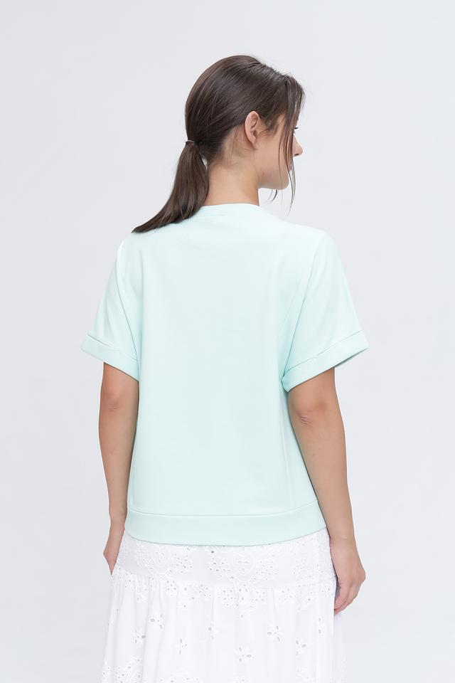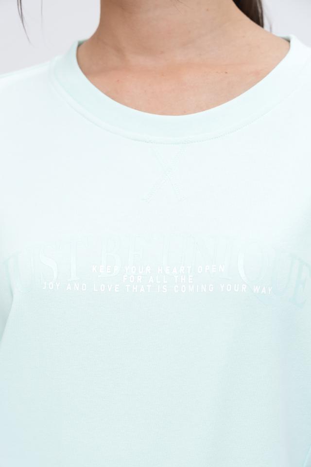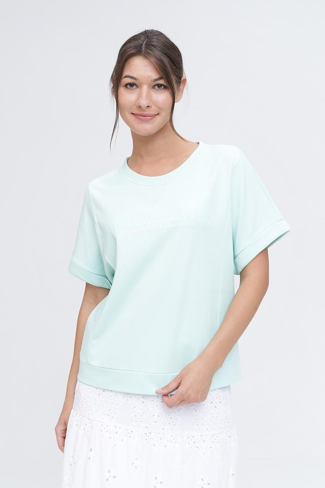 Мятный пуловер Monari свободного кроя с коротким рукавом и оригинальной надписью на лицевой стороне. Изготовлен из мягкого хлопка с добавлением полиэстера для комфорта и долговечности. Состав: хлопок 70%, полиэстер 30%