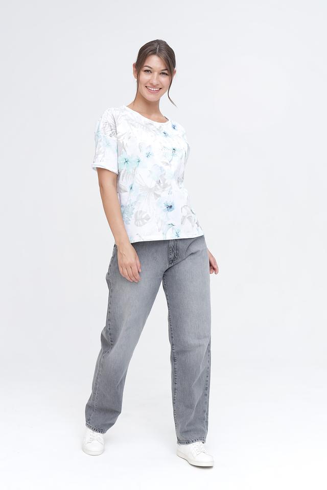 Эта стильная футболка от Monari выполнена из мягкого и приятного к телу 100% хлопка. Преобладающий цвет – белый, украшенный изысканным цветочным принтом в голубых и серых тонах.