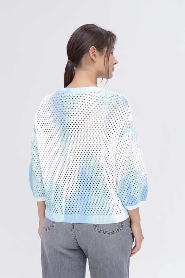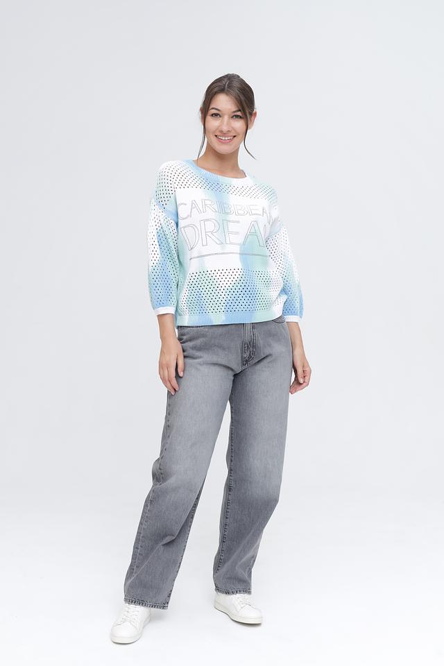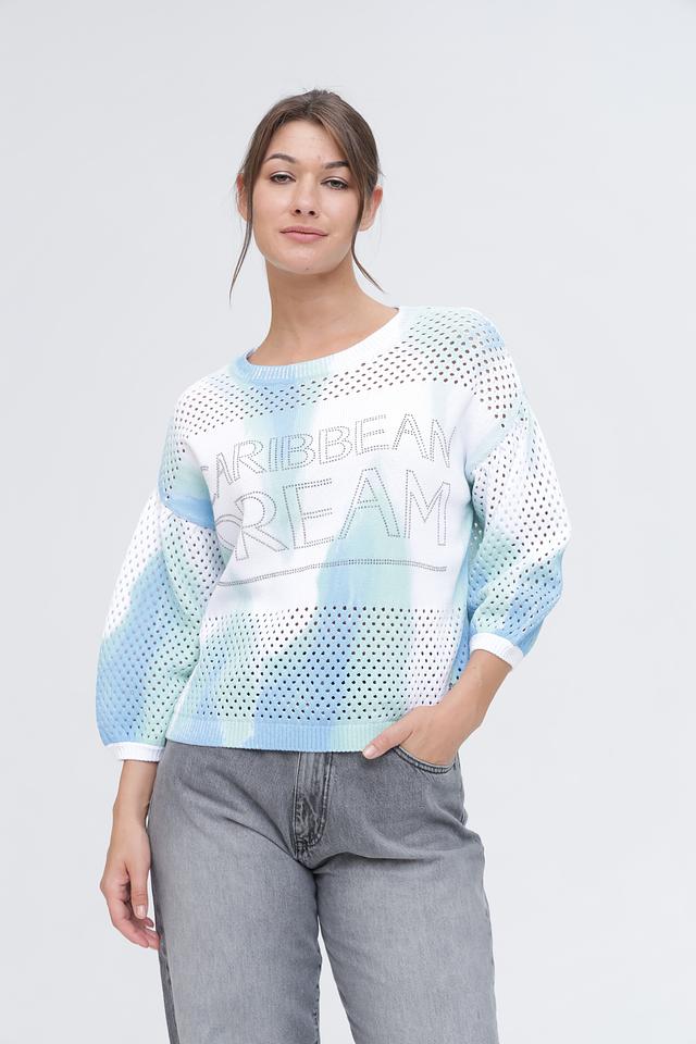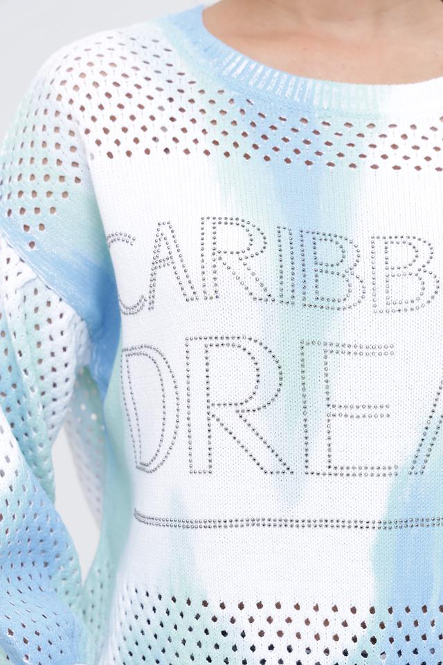 Пуловер имеет свободный крой и короткие рукава, что делает его идеальным для тёплой погоды. Ажурная вязка добавляет лёгкости и воздушности, а яркий принт "Caribbean Dream" привносит нотку летнего настроения.