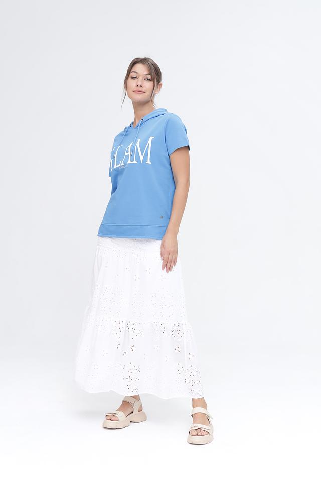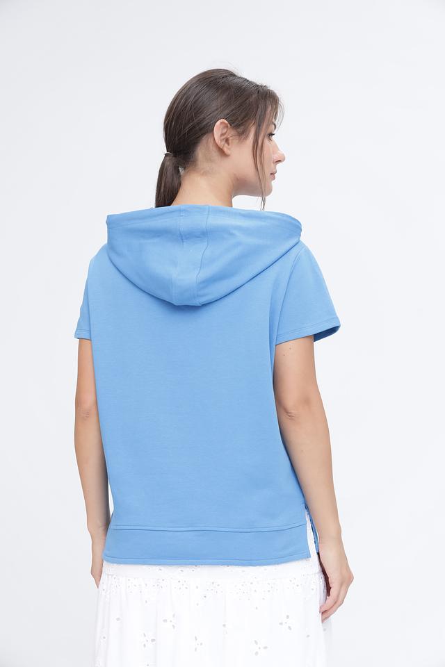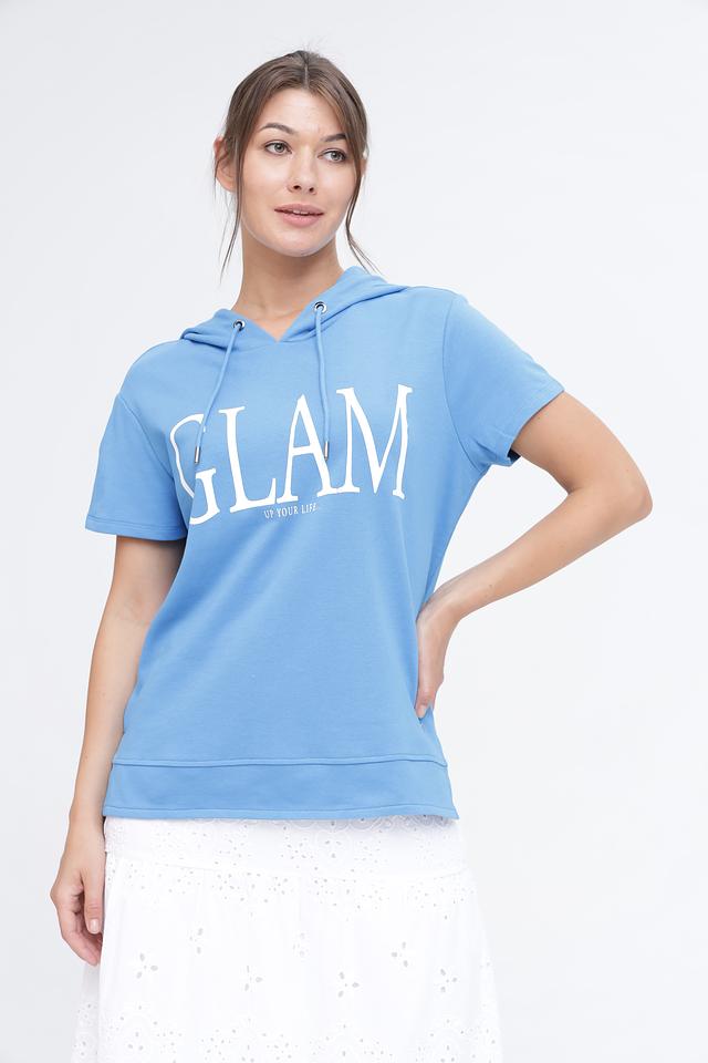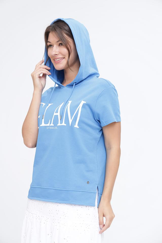 Голубой пуловер от Monari с коротким рукавом и капюшоном украшен белой надписью "GLAM". Модель выполнена из мягкого хлопка и идеально подходит для создания повседневных образов. Состав: хлопок 100%