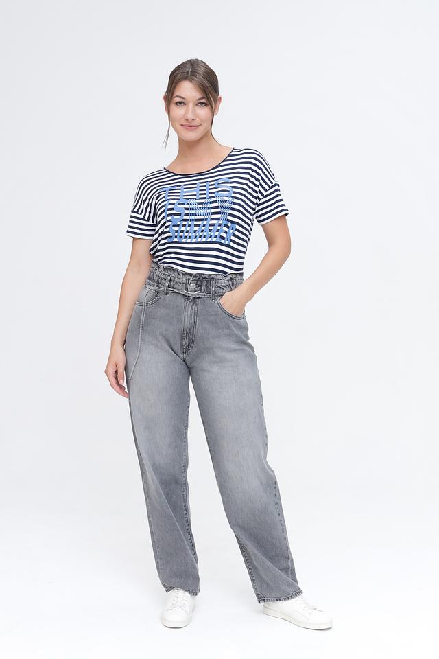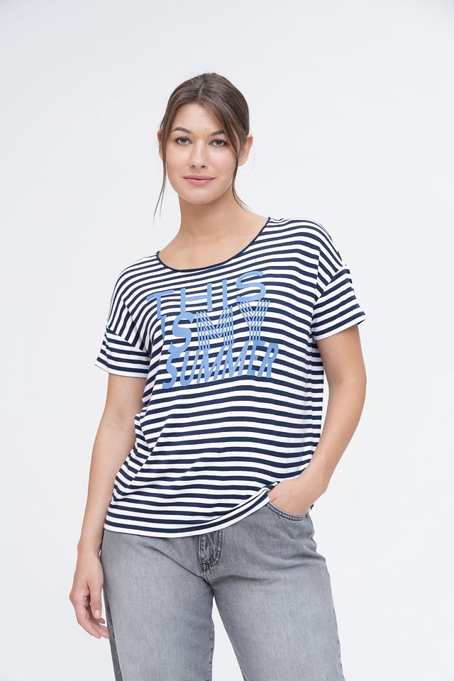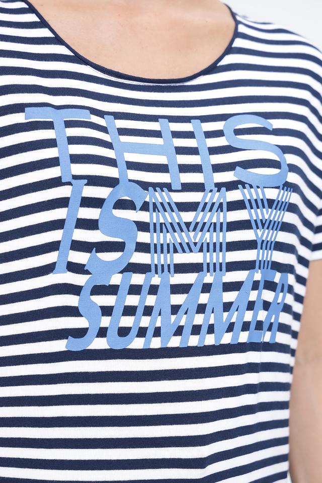 Женская футболка Monari синего и белого цвета с ярким принтом "This is my summer". Модель выполнена из мягкой вискозы с добавлением эластана для комфортной посадки и свободы движений. Состав: вискоза 95%, эластан 5%
