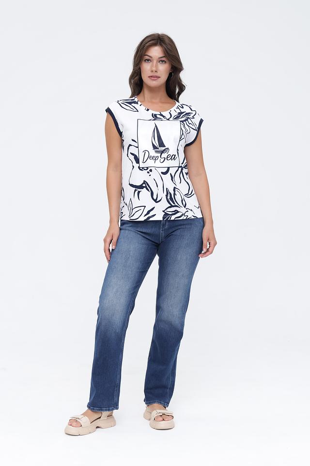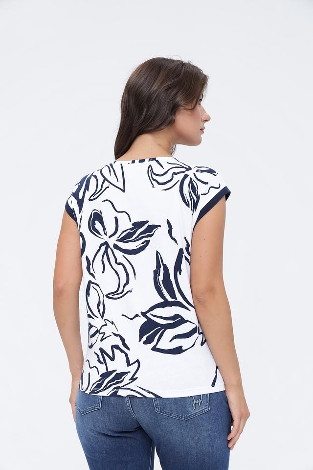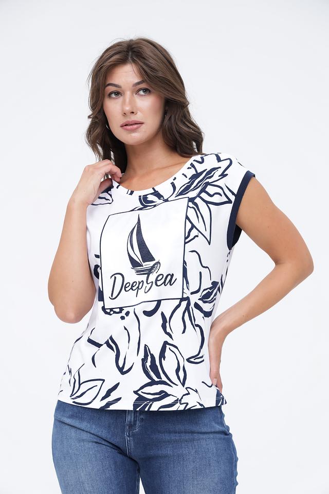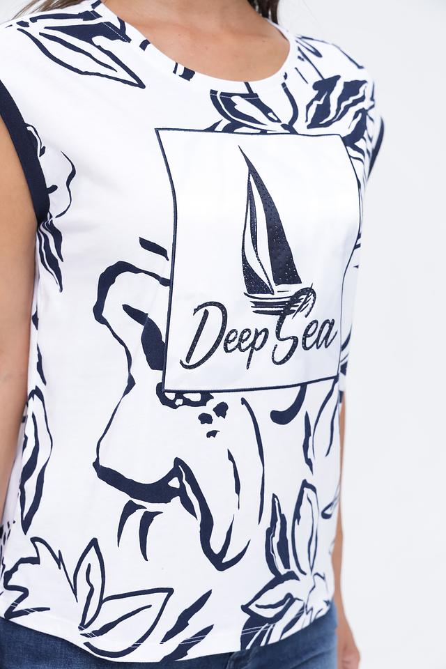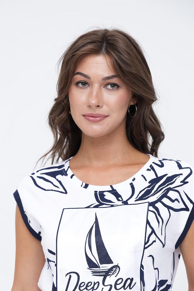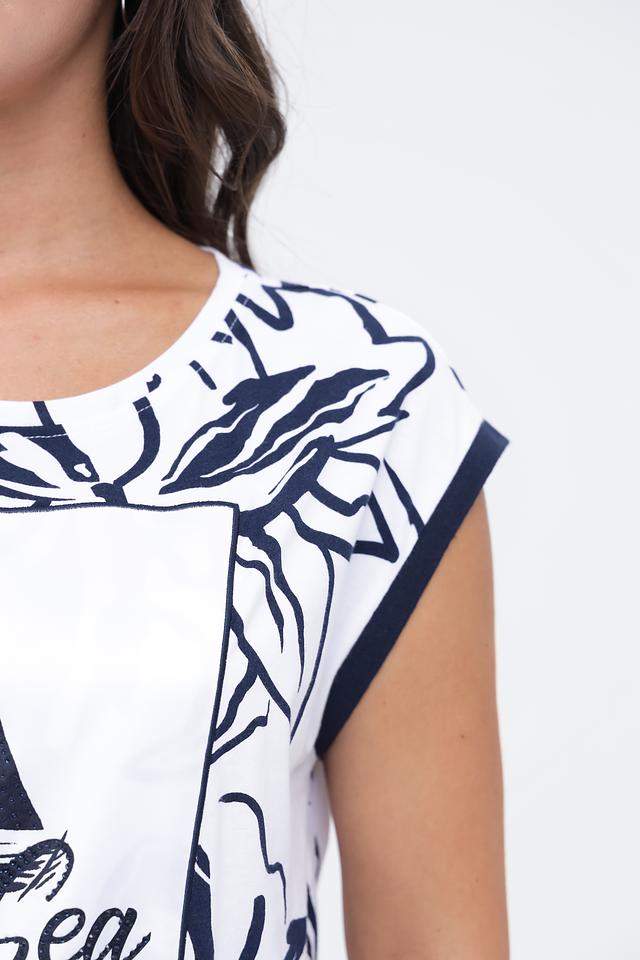 Топ Monari белого цвета с ярким морским принтом и короткими рукавами. Изготовлен из 100% хлопка, обеспечивая комфорт и воздухопроницаемость. Стильный и удобный выбор для летнего гардероба. Состав: хлопок 100%
