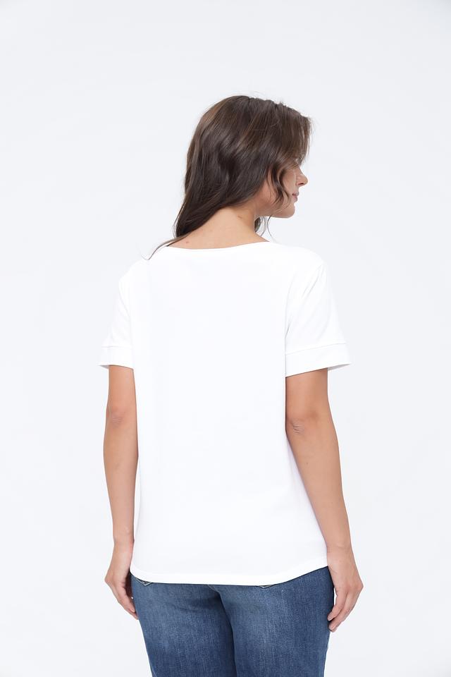 Футболка имеет прямой крой, который хорошо сидит на фигуре, не сковывая движений. V-образный вырез горловины придает образу женственности. Эта модель идеально сочетается с джинсами, шортами или юбками, создавая непринужденный и стильный образ.