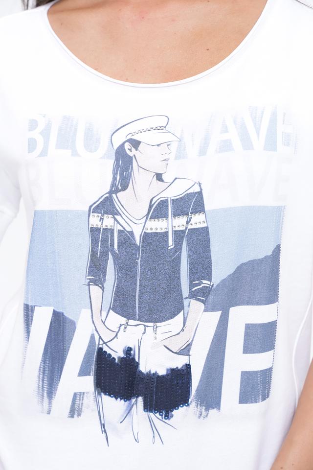 Особенностью данной модели является яркий принт с изображением морской тематики, выполненный в синих и серых тонах. Принт добавляет футболке оригинальности и стиля.