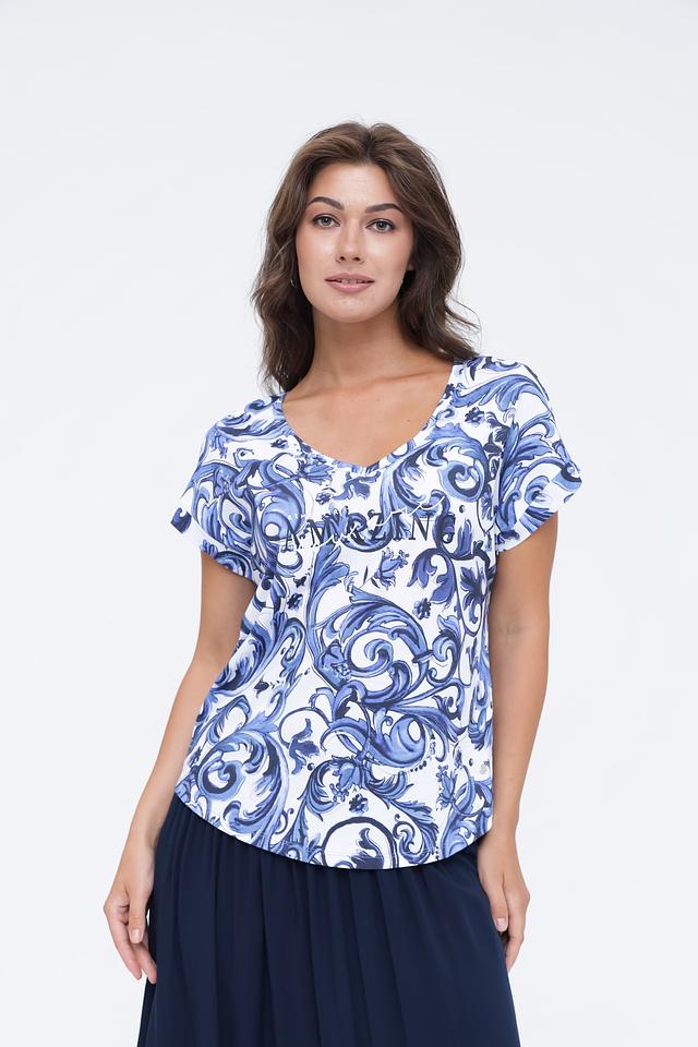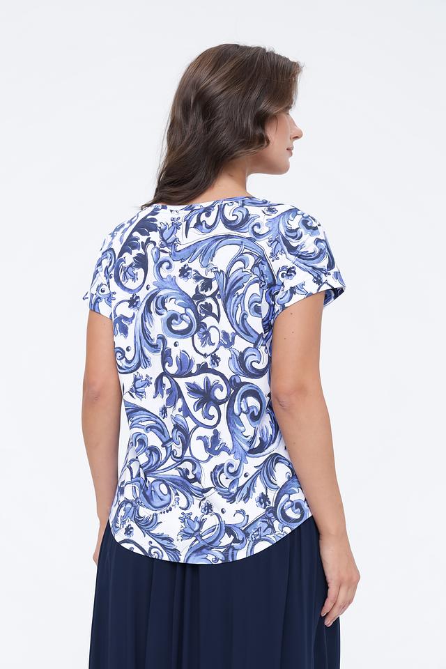 Модель имеет V-образный вырез горловины и короткие рукава, что делает ее подходящей для теплой погоды. Блуза выполнена из высококачественного хлопка с добавлением модала, благодаря чему она приятна на ощупь, хорошо драпируется и не мнется.
