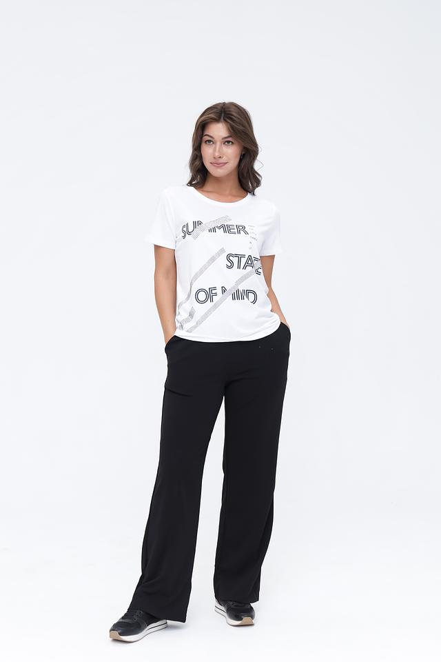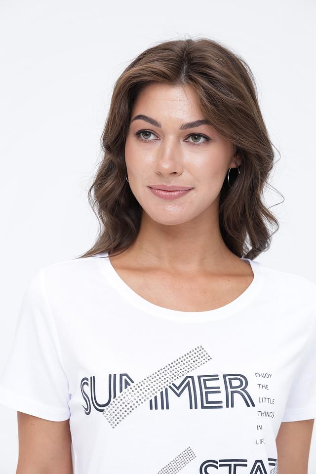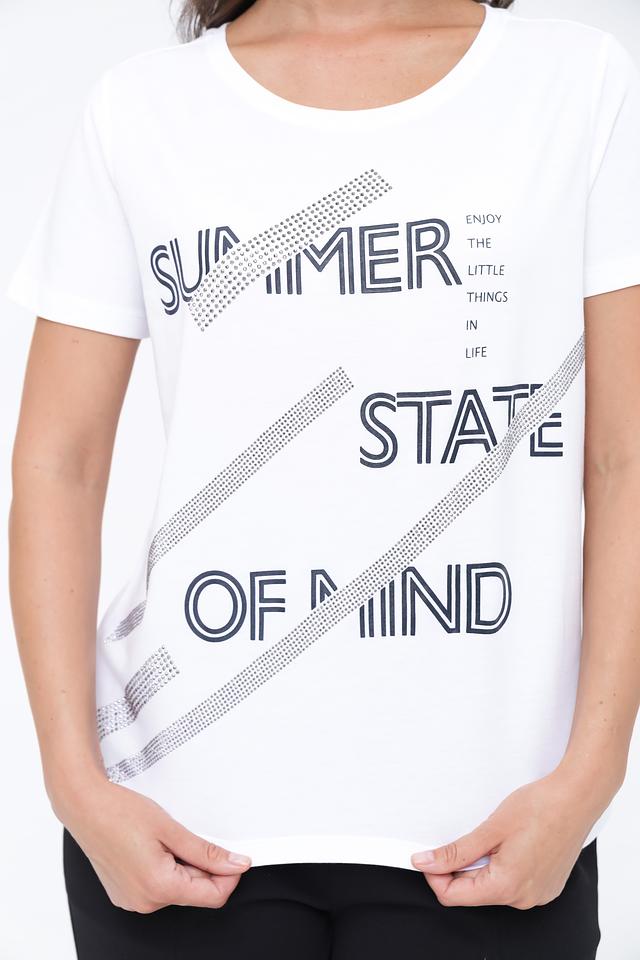 Особенностью данной модели является оригинальный принт с надписями "SUMMER", "STATE OF MIND" и "ENJOY THE LITTLE THINGS IN LIFE". Декоративные элементы, выполненные в виде страз, добавляют футболке изысканности и привлекательности.