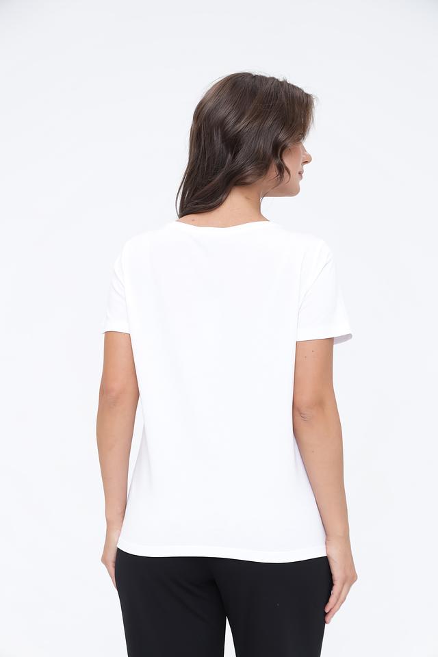 Футболка имеет прямой крой и короткие рукава, что обеспечивает свободу движений. Она идеально подходит для создания повседневных образов, сочетаясь с джинсами, шортами или юбками. Состав ткани: 50% хлопок, 50% модал.