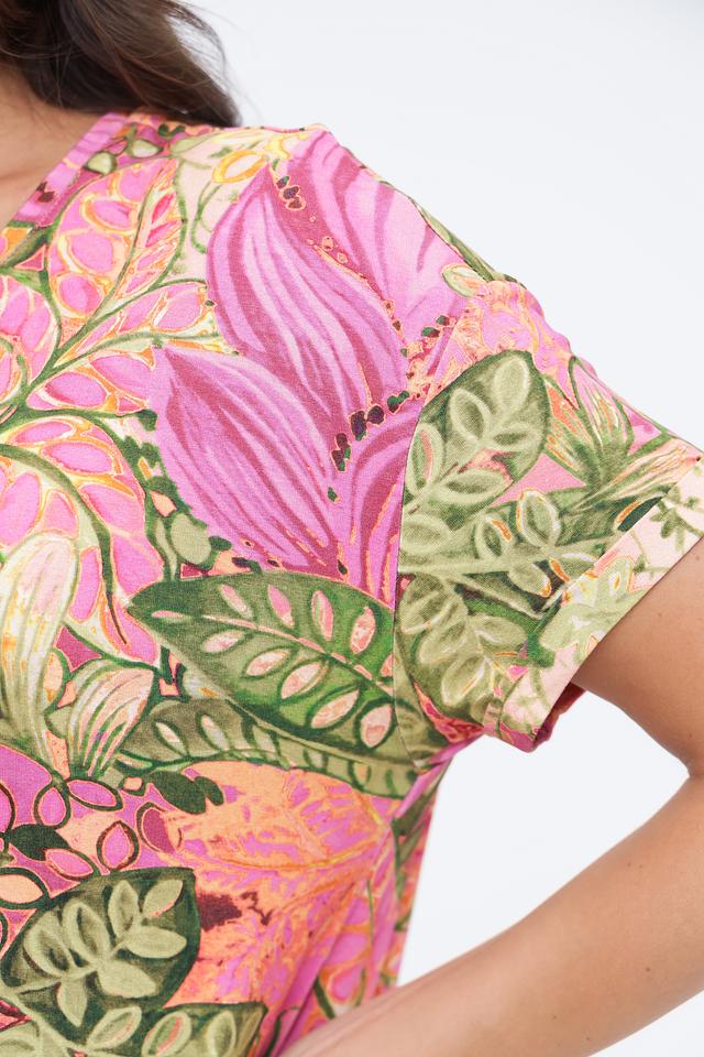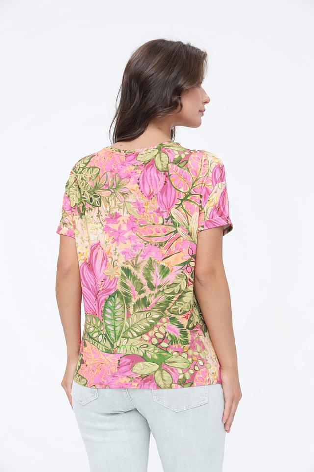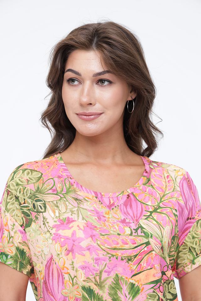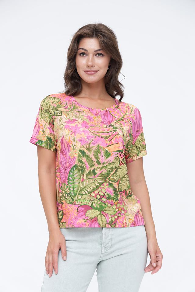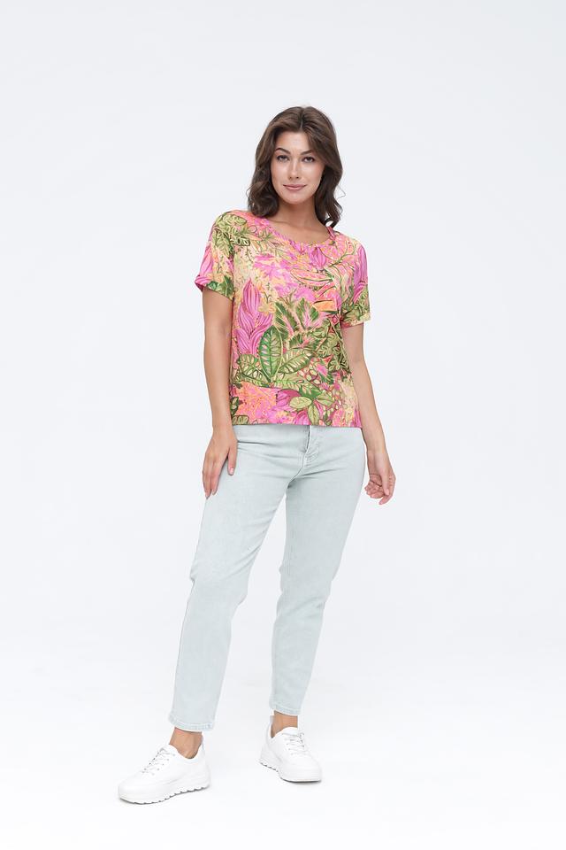 Блуза имеет короткие рукава и округлый вырез горловины. Ее украшает красочный цветочный принт, который придает ей легкость и женственность. Модель идеально подходит для создания повседневных и праздничных образов.