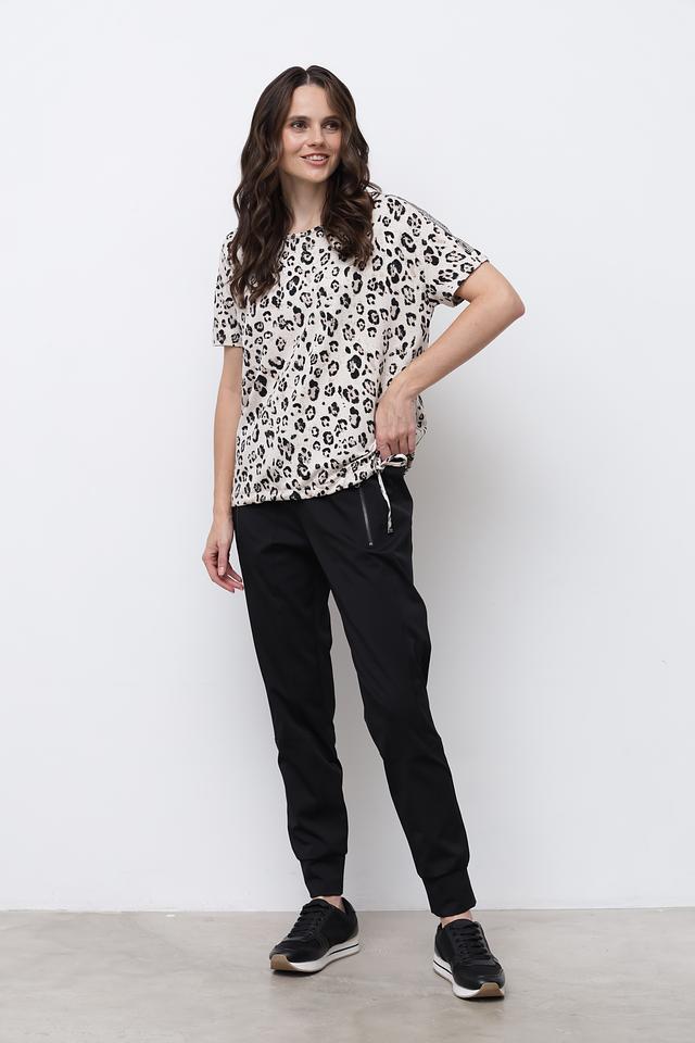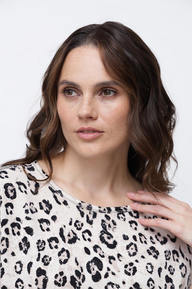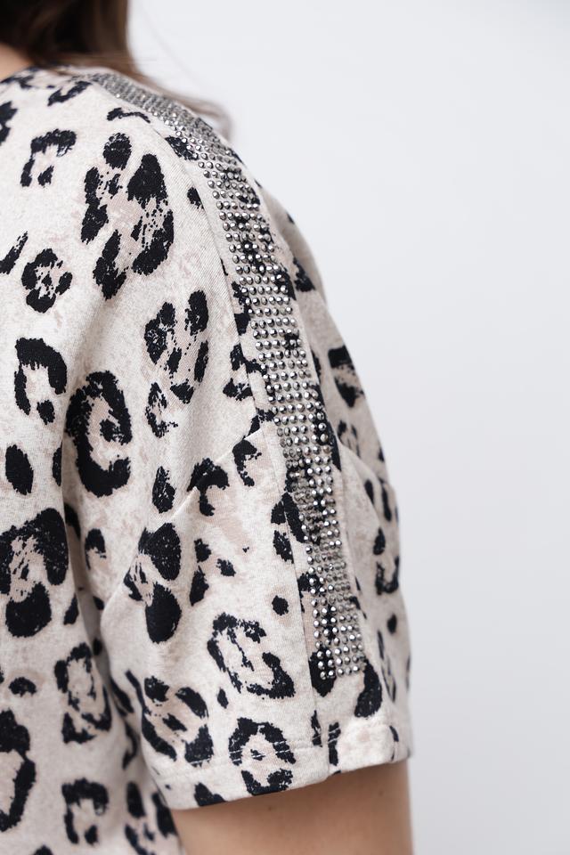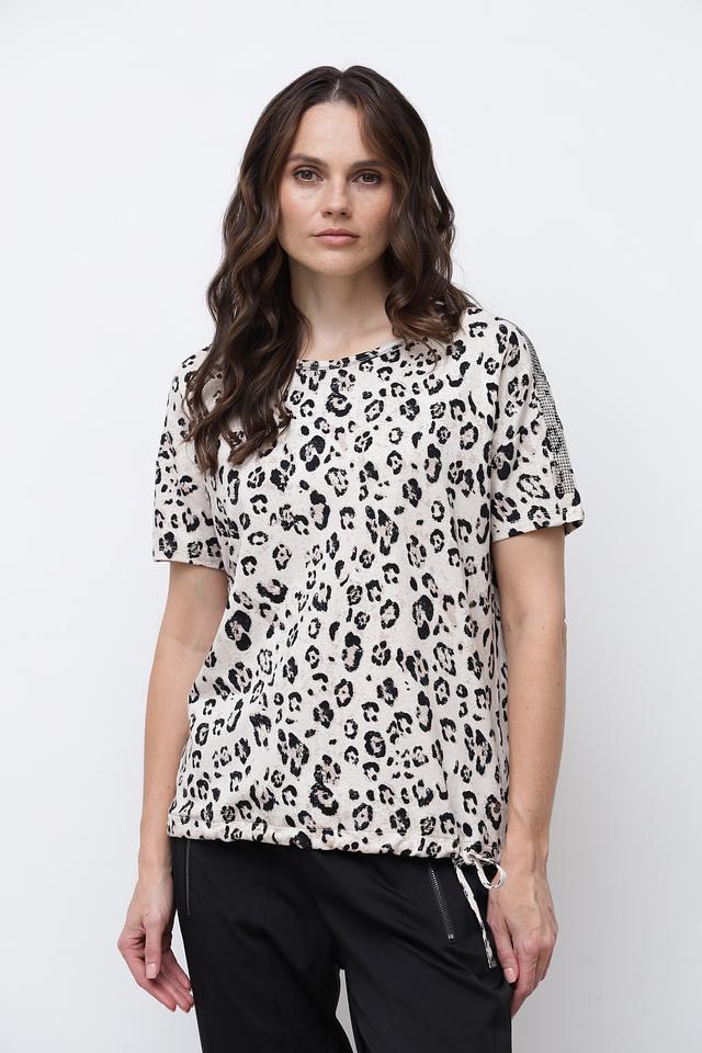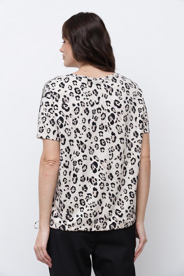 Основной цвет футболки – бежевый, но её главным украшением является эффектный леопардовый принт, который добавляет образу динамичности и оригинальности. Крой футболки свободный, что обеспечивает свободу движений и комфорт в течение всего дня.