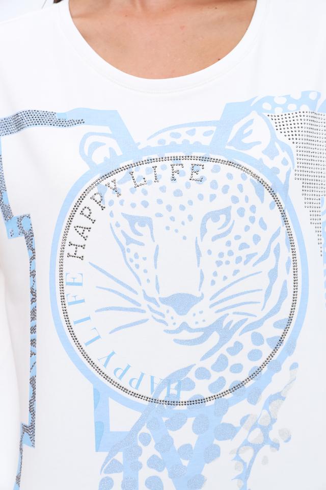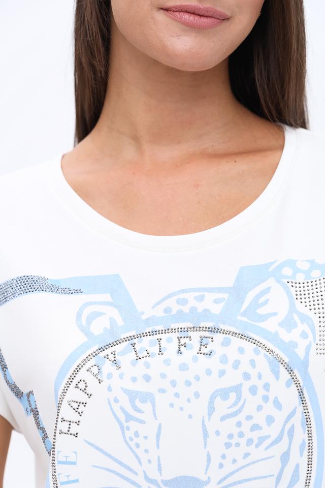 Основным акцентом является эффектный принт с изображением тигра и надписью "Happy Life", выполненный в голубых тонах. Принт декорирован стразами, что придает изделию изысканность и блеск.