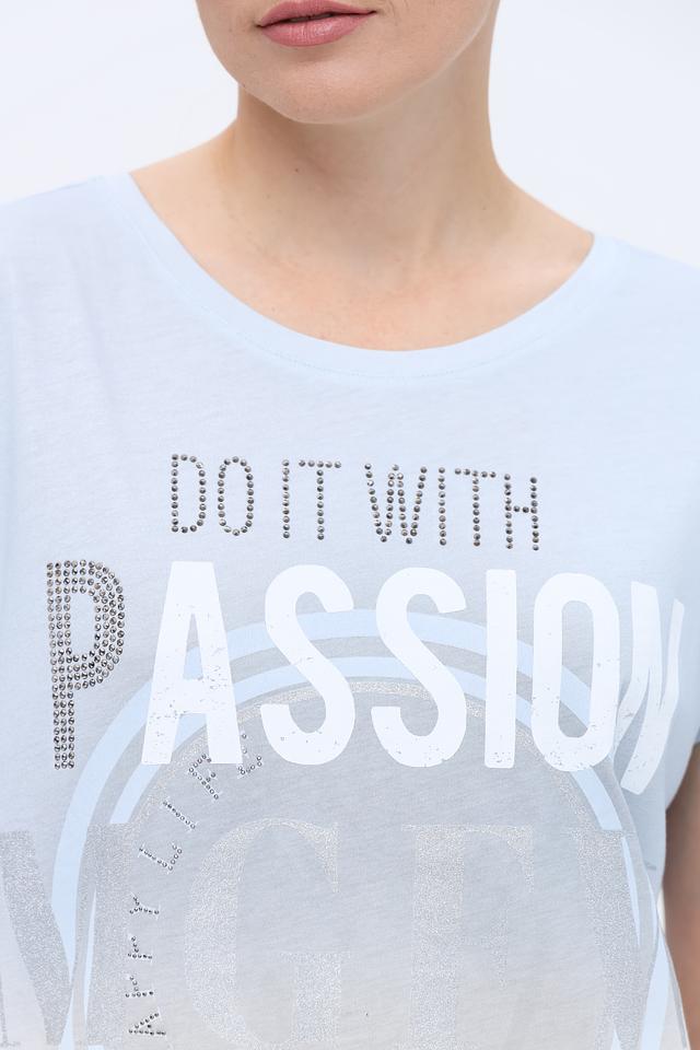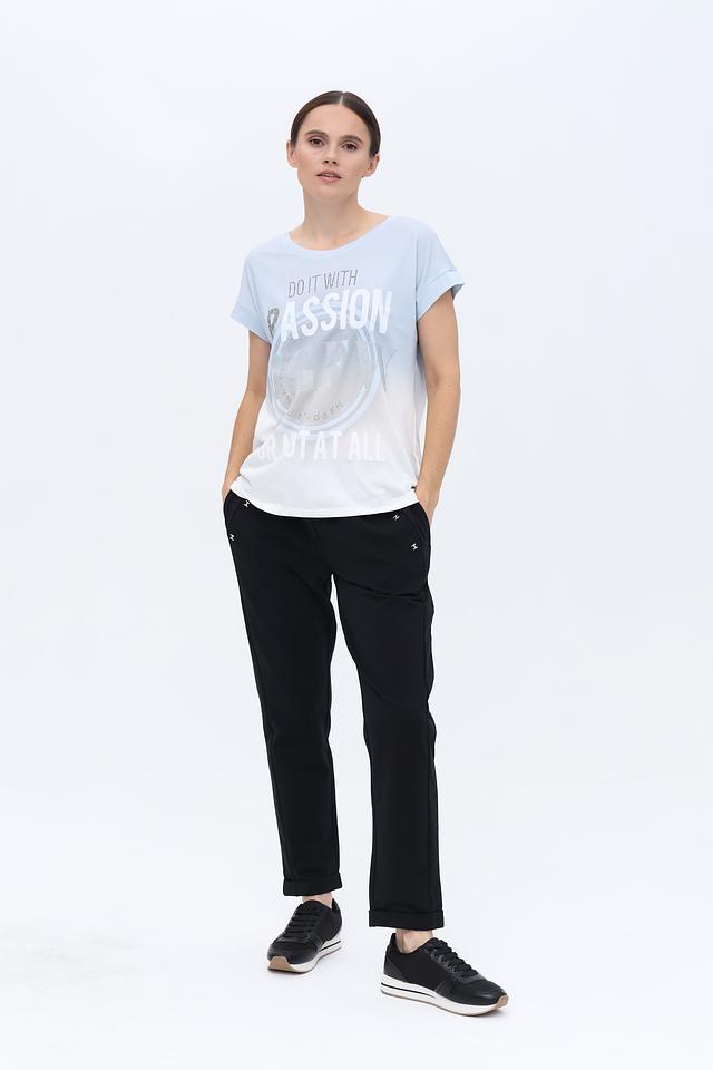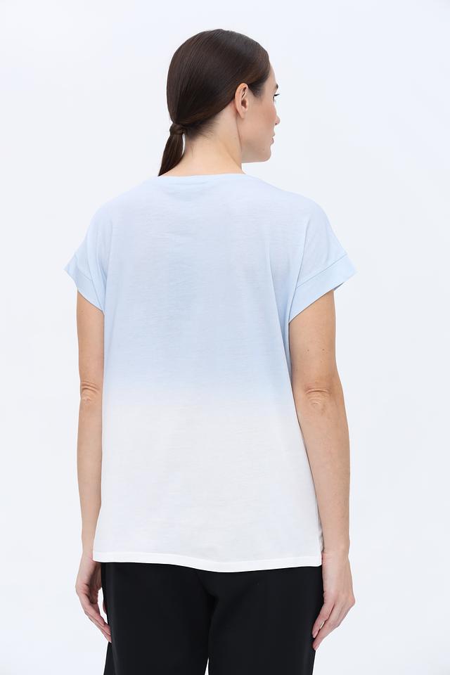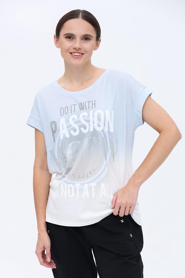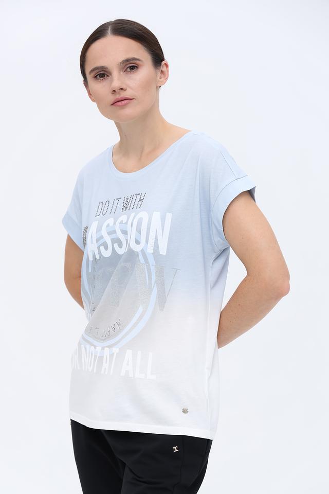 Женская футболка Monari голубого цвета с эффектным принтом и короткими рукавами. Изготовлена из мягкого хлопка с модалом, обеспечивающего комфорт и приятные ощущения при носке. Стильный и удобный вариант для повседневного образа. Состав: хлопок 50%, модал 50%