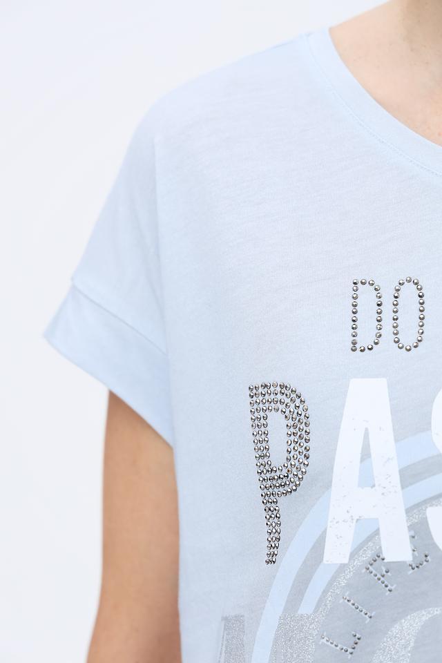 Эта футболка от Monari станет отличным дополнением к вашему гардеробу. Она выполнена в нежном голубом цвете с градиентным переходом к белому в нижней части. Передняя часть футболки украшена ярким принтом с надписями и графическими элементами, что придает ей индивидуальность.