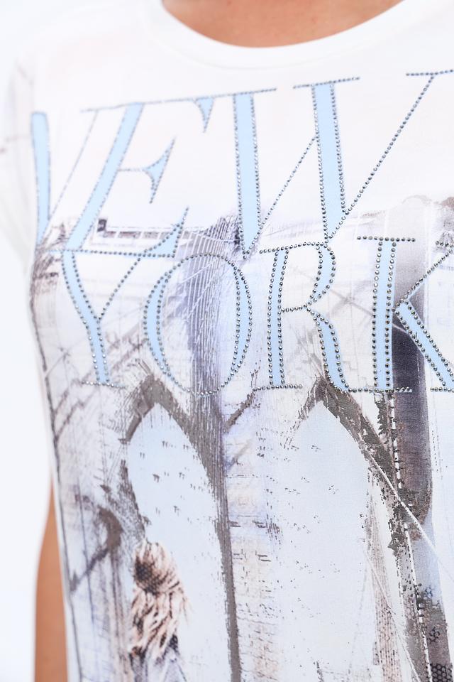 Эта футболка от Monari – идеальный выбор для создания непринужденного и модного образа. Футболка выполнена в белом цвете и украшена эффектным принтом с изображением пейзажа Нью-Йорка и надписью "New York".