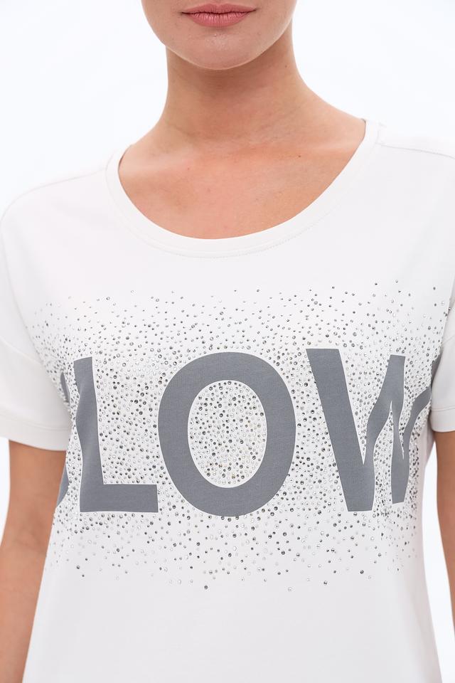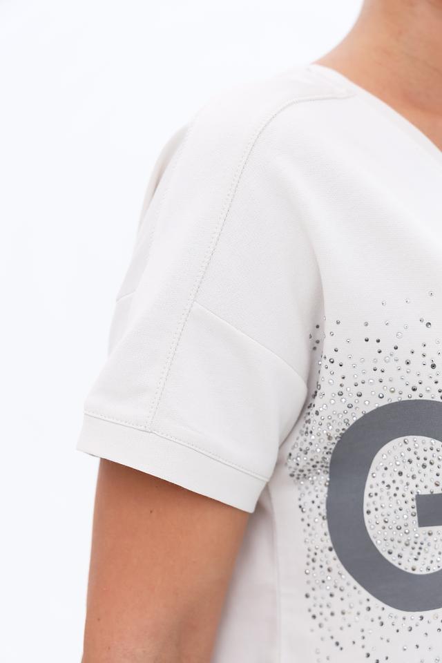 Эта стильная футболка от Monari станет отличным дополнением к вашему гардеробу. Выполнена в белом цвете и украшена эффектной надписью "Glow", выполненной в сером цвете и декорированной мерцающими стразами.