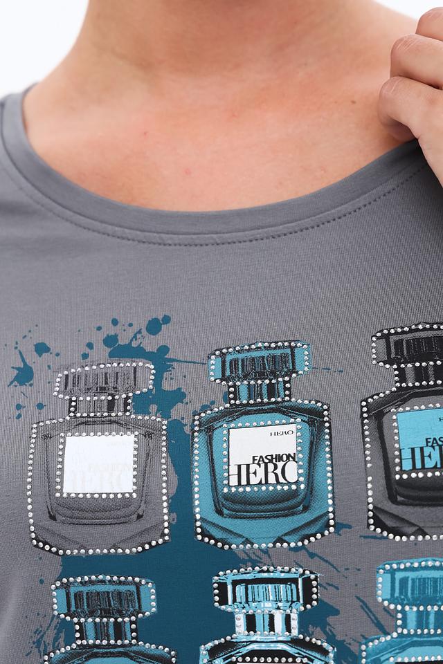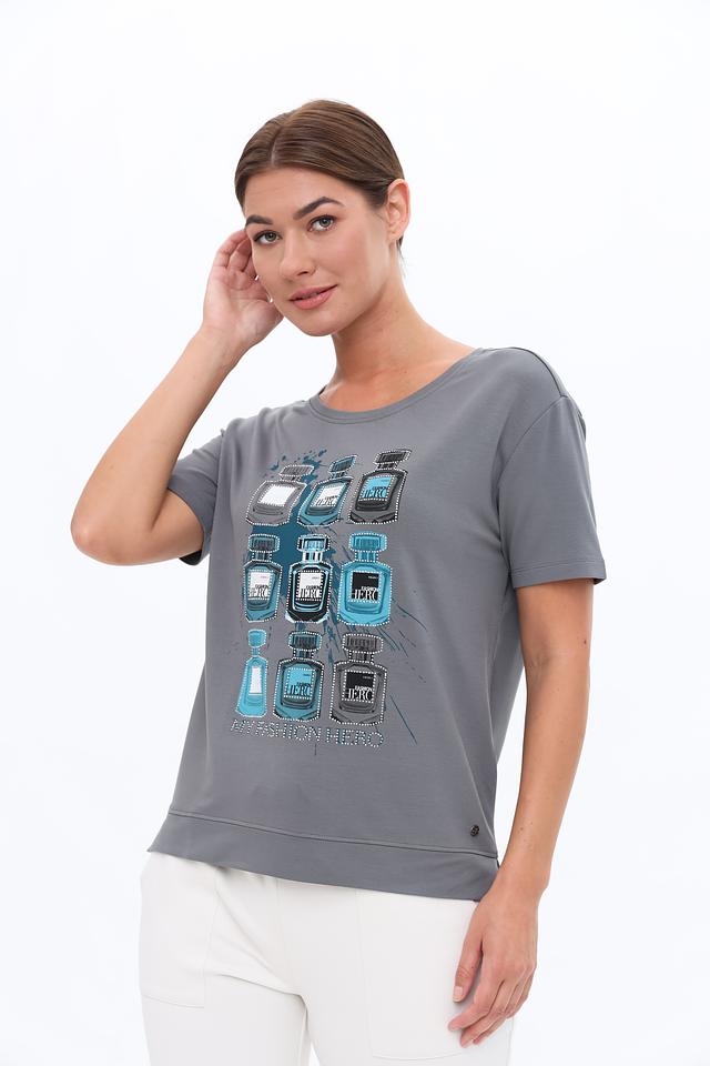 Стильная футболка Monari серого цвета с оригинальным принтом в виде флаконов духов. Изготовлена из мягкой и приятной к телу ткани с добавлением вискозы и модала, обеспечивающей комфорт в носке. Состав: вискоза 45%, модал 45%, эластан 10%