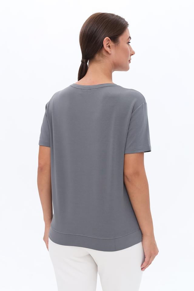 Модель имеет прямой крой и короткие рукава, что делает ее удобной для повседневной носки. Футболка изготовлена из высококачественного трикотажа, состоящего из 45% вискозы, 45% модала и 10% эластана. Такое сочетание материалов обеспечивает мягкость, комфорт и хорошую посадку по фигуре.