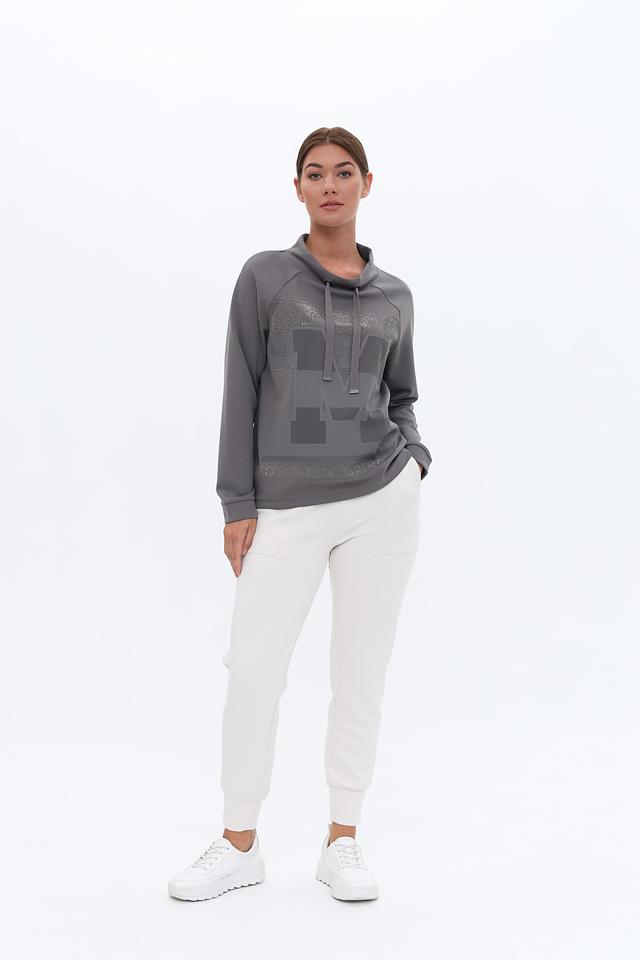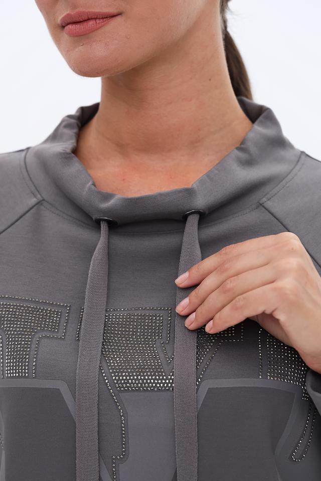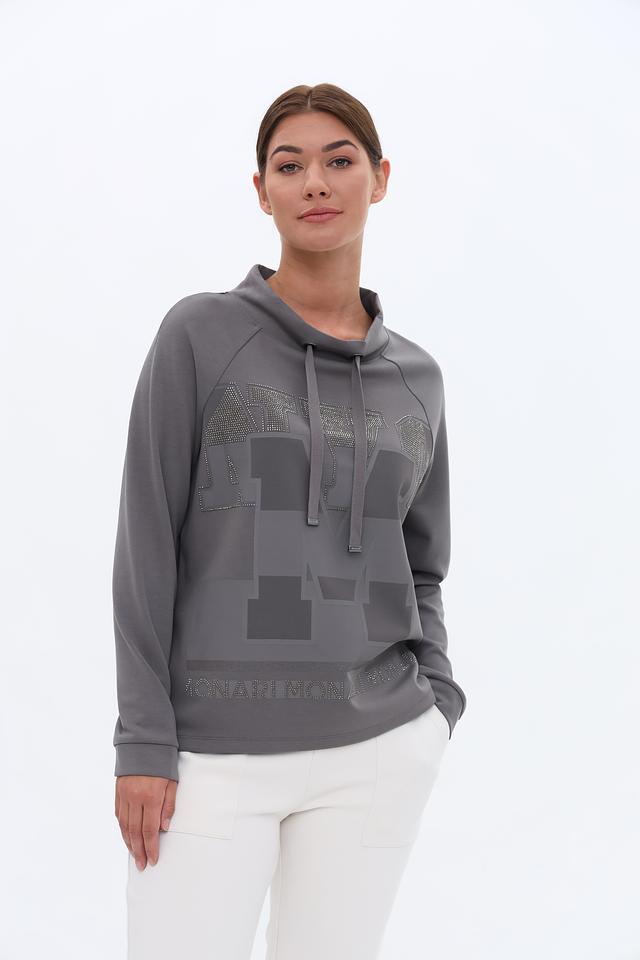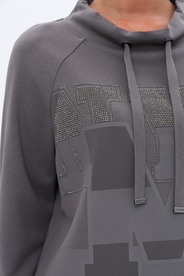 Серый пуловер Monari – это стильная и комфортная модель с оригинальным декором из страз. Удобный капюшон с кулиской и свободный крой делают этот пуловер идеальным выбором для повседневной носки. Состав: полиэстер 55%, вискоза 38%, эластан 7%