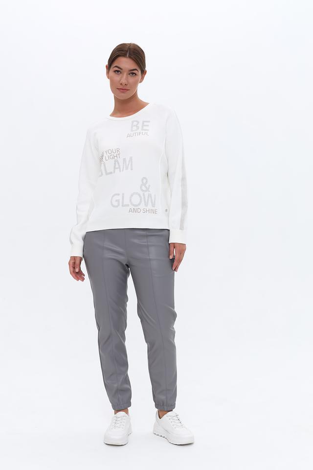 Особенностью данного пуловера является оригинальный принт с надписями "BE BEAUTIFUL", "MAKE YOUR SOUL LIGHT", "GLAM & GLOW AND SHINE", выполненный в серебристом цвете. Принт добавляет изделию изюминку и делает его более интересным.