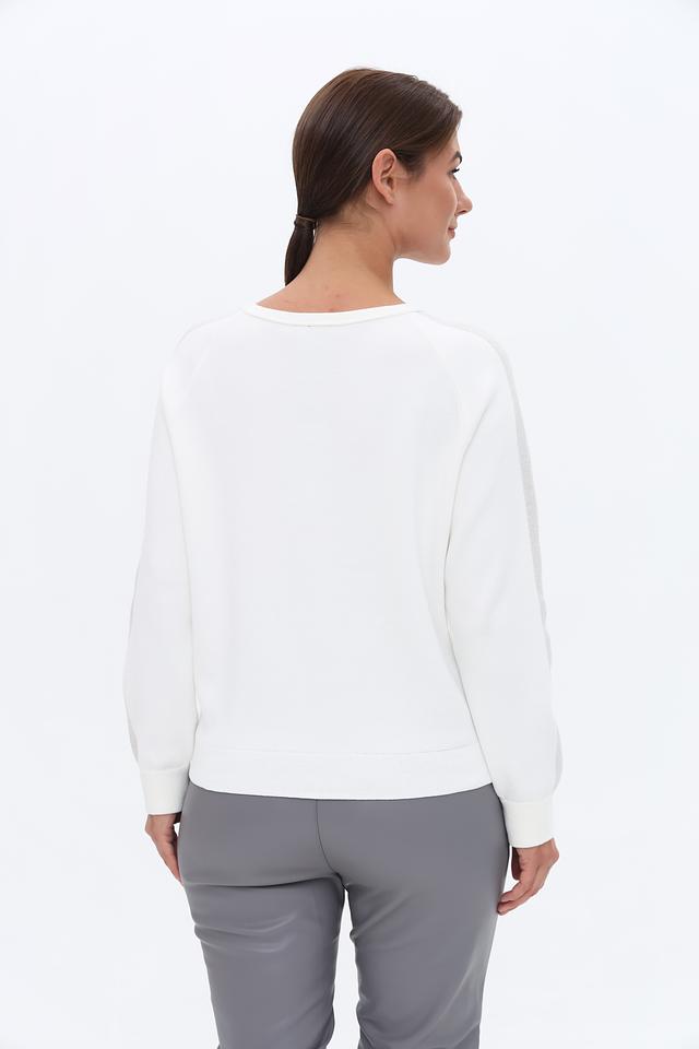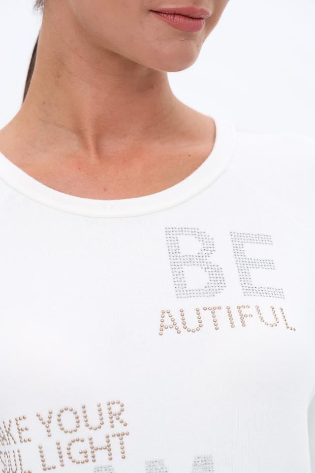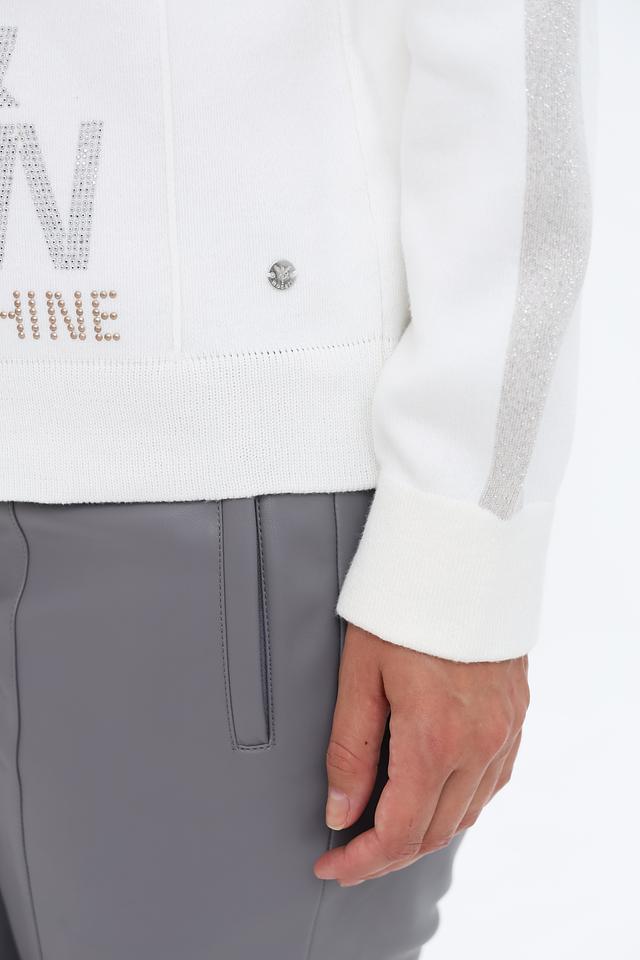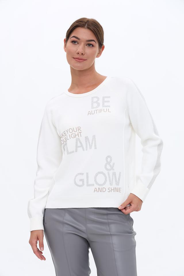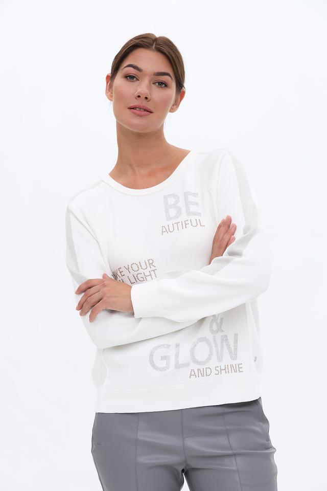 Белый пуловер Monari с оригинальным принтом и надписями станет стильным дополнением к вашему гардеробу. Изготовлен из мягкого хлопка с добавлением металлизированной нити, что придает ему легкий блеск. Состав: хлопок 98%, метализ.нить 2%