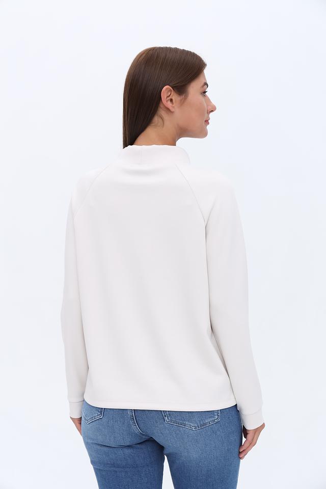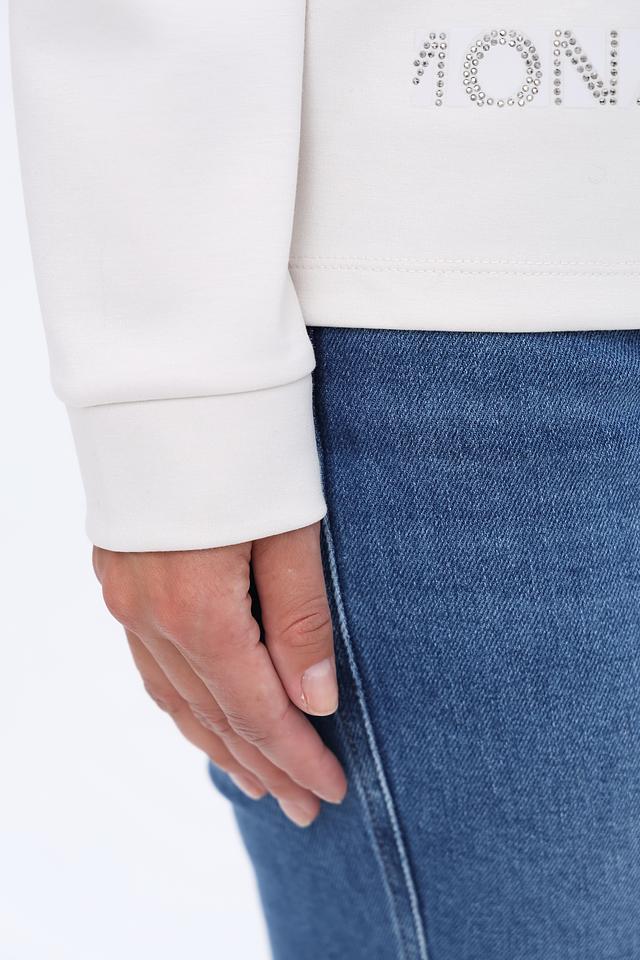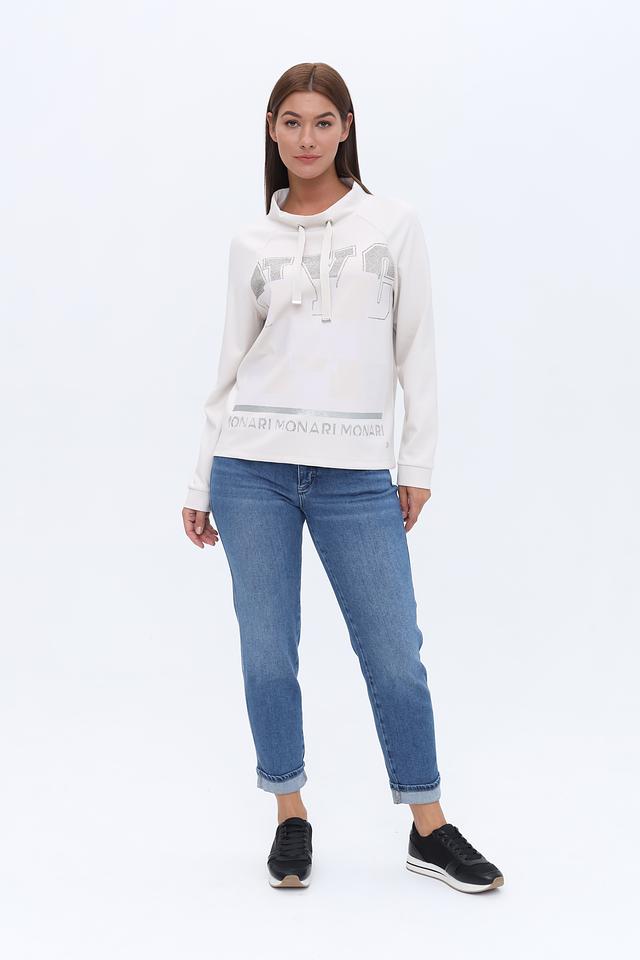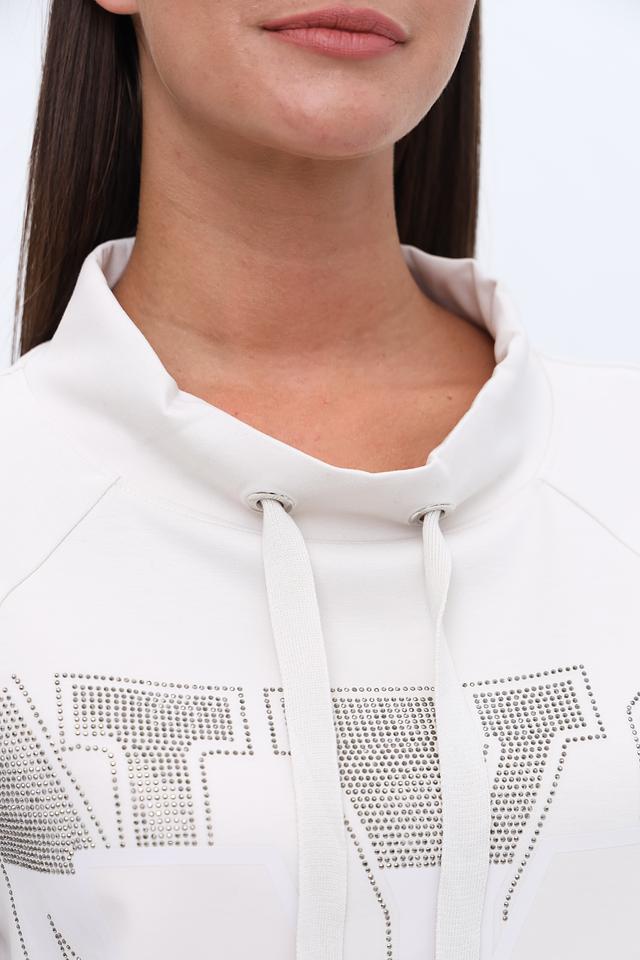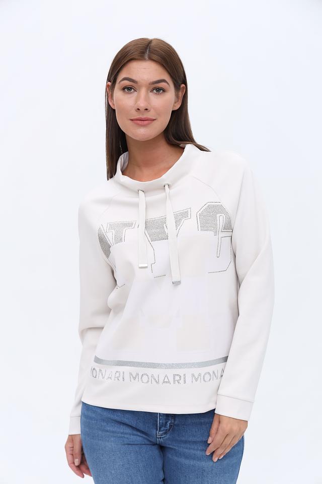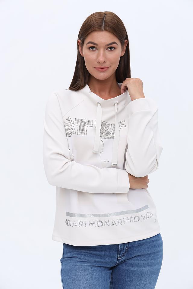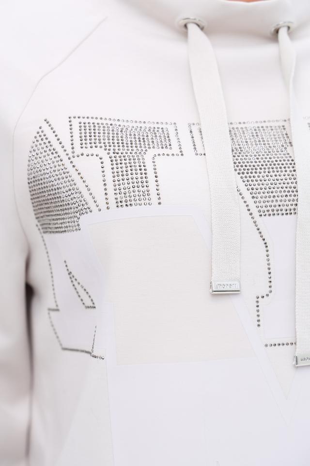 Белый пуловер Monari с оригинальным декором из страз и логотипом бренда. Модель с удобным капюшоном и мягкой ткани обеспечит комфорт и стильный образ. Состав: полиэстер 55%, вискоза 38%, эластан 7%