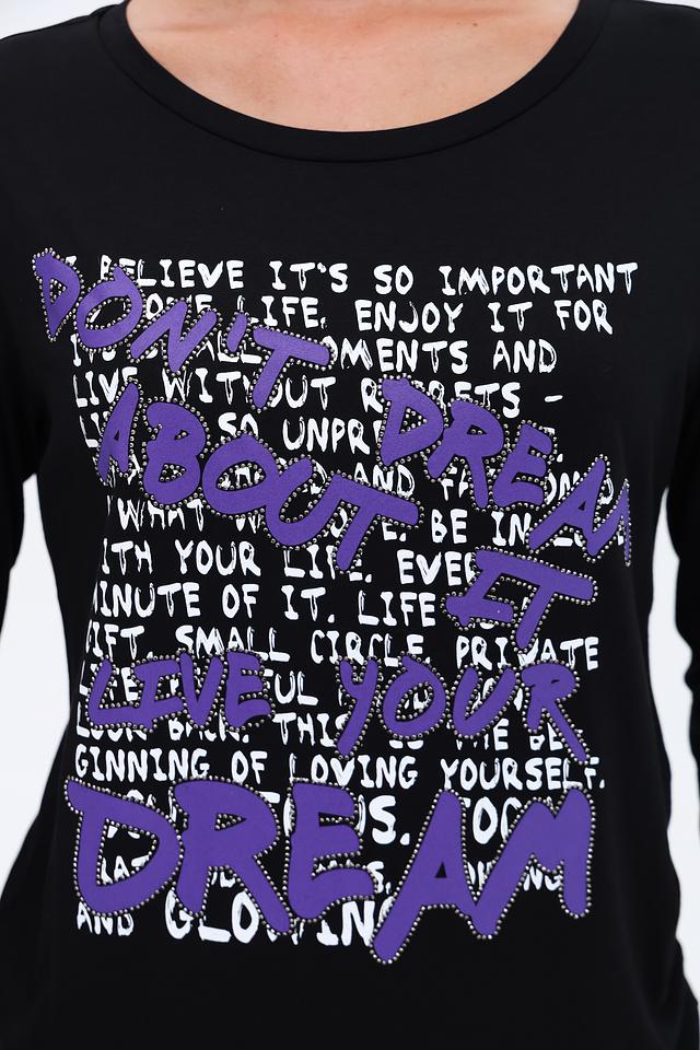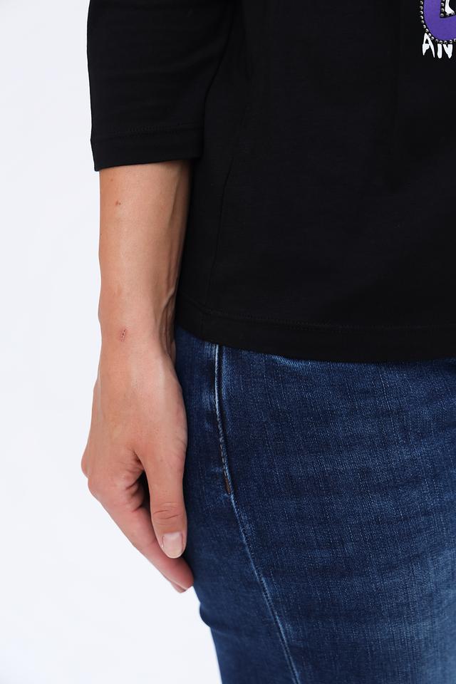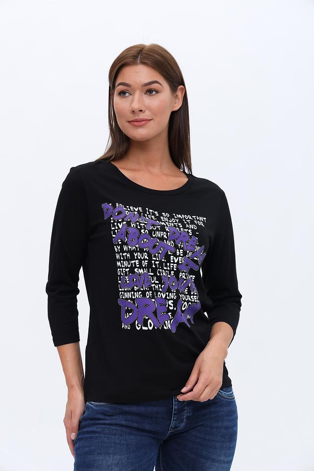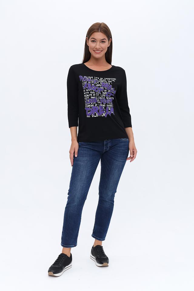 Этот стильный лонгслив от Monari станет отличным дополнением к вашему гардеробу. Выполненный в классическом чёрном цвете, он украшен ярким и запоминающимся принтом с надписями.