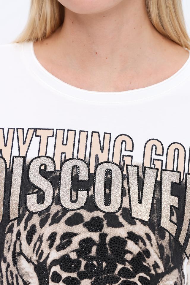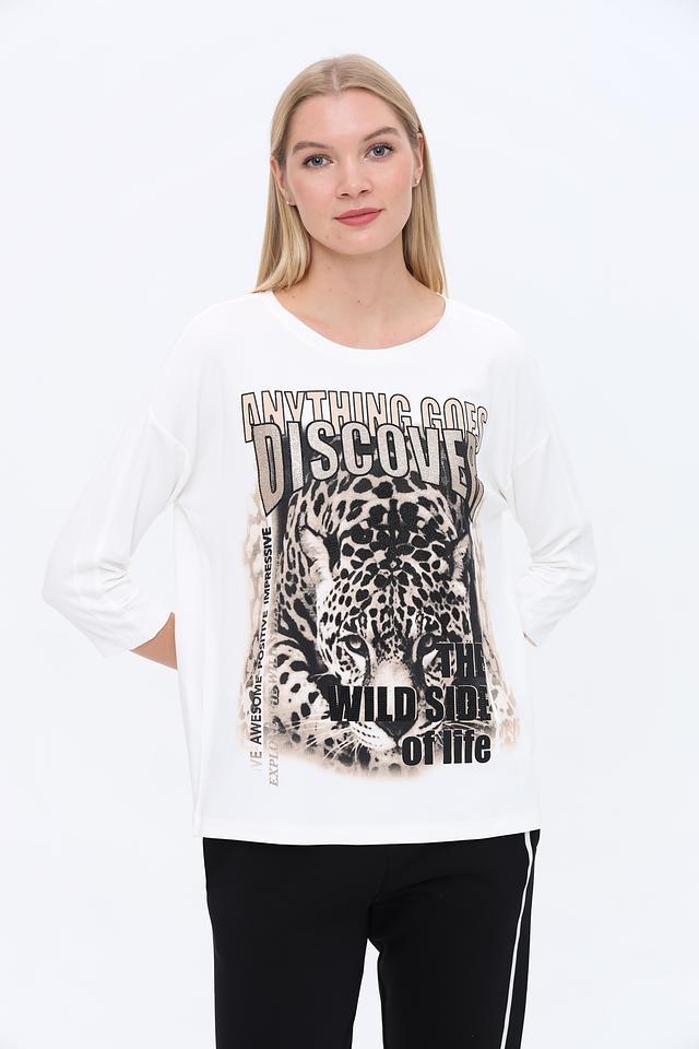 Белый лонгслив Monari с ярким принтом леопарда и надписями станет стильным дополнением к вашему гардеробу. Модель выполнена из мягкой и приятной к телу ткани, обеспечивающей комфорт в течение дня. Состав: вискоза 45%, модал 45%, эластан 10%