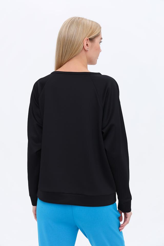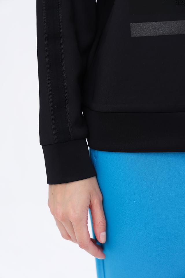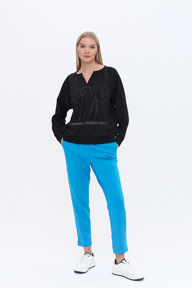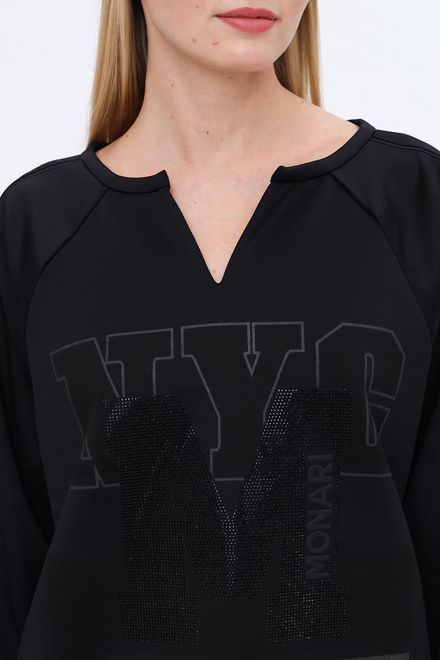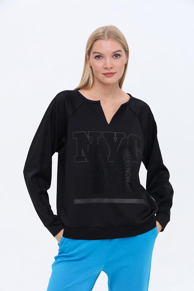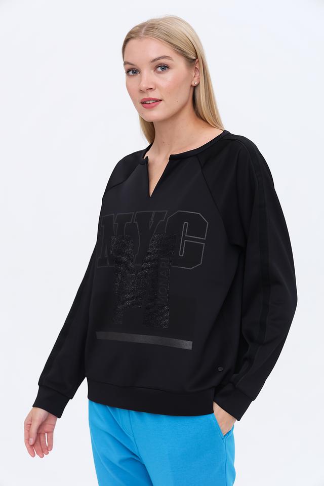 Чёрный пуловер Monari с принтом NYC – стильная и комфортная модель для повседневного образа. Изготовлен из мягкого полиэстера с добавлением эластана, обеспечивающего удобную посадку. Декорирован эффектным принтом с названием города. Состав: полиэстер 96%, эластан 4%