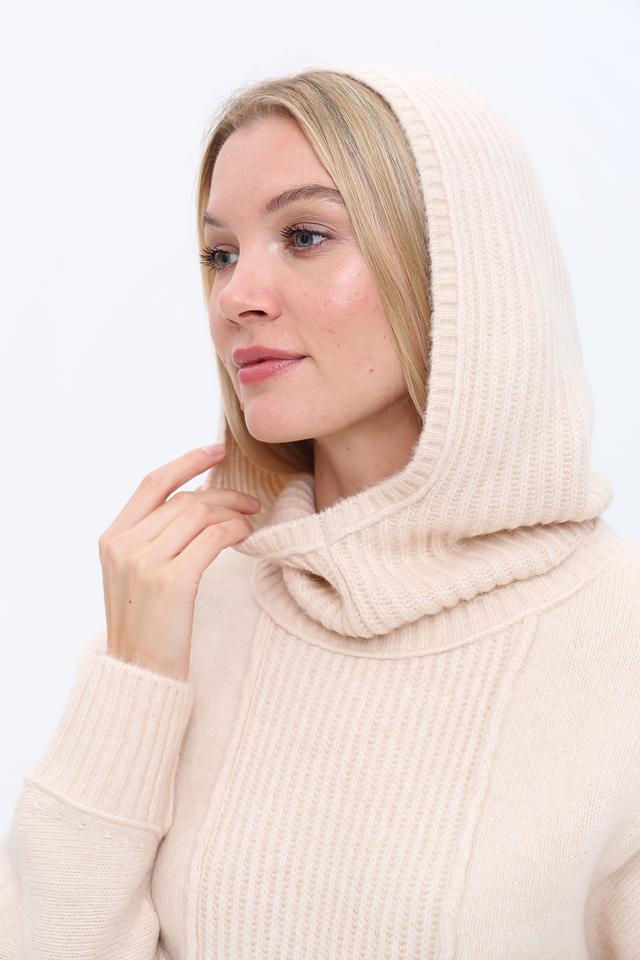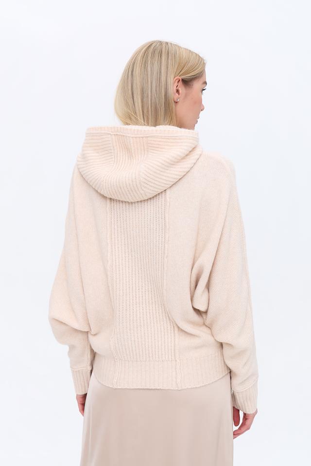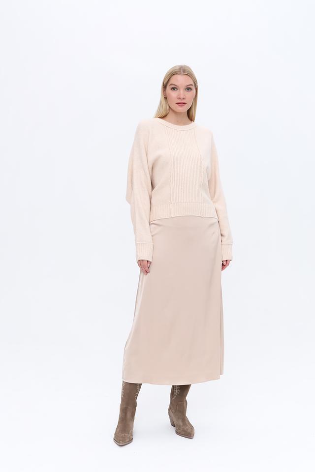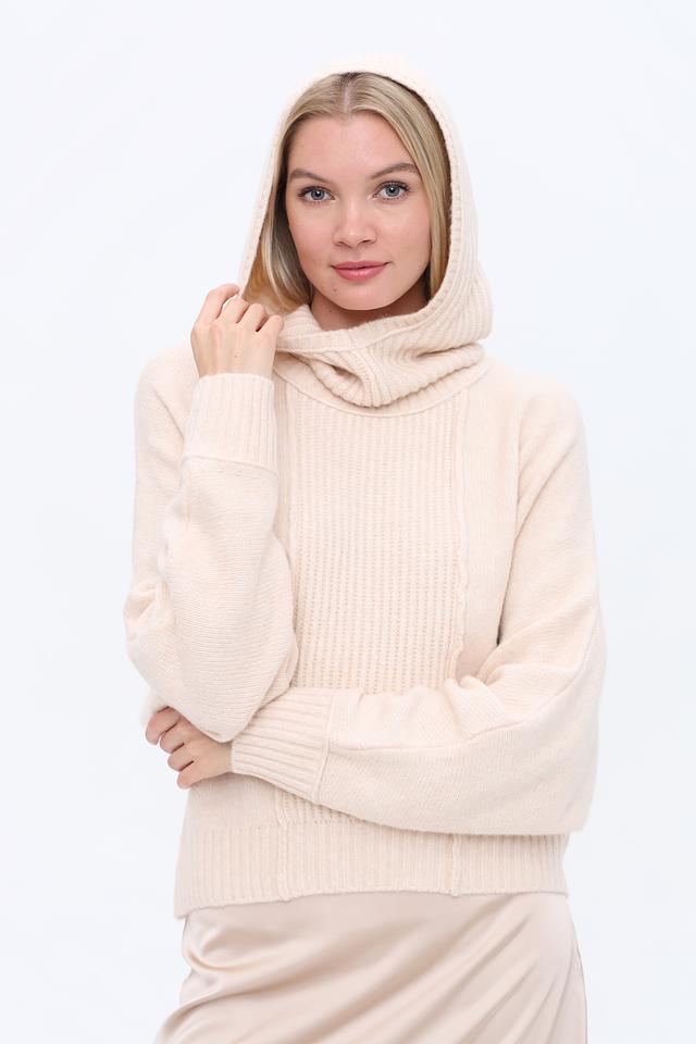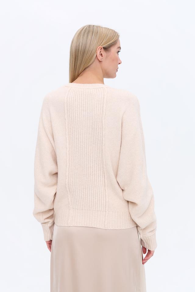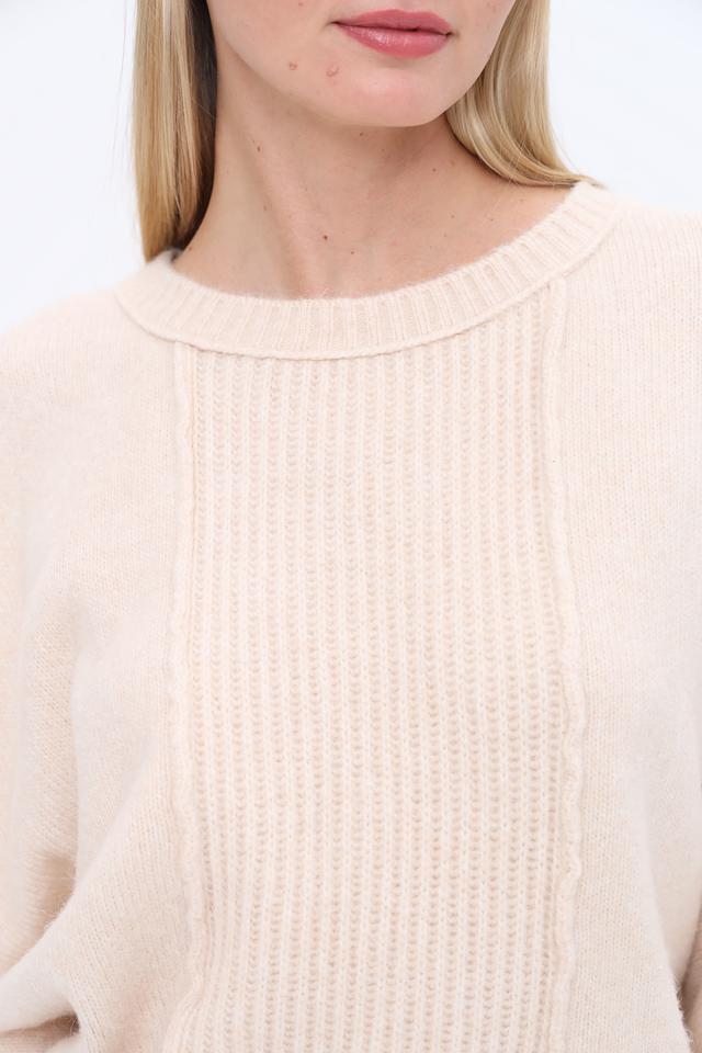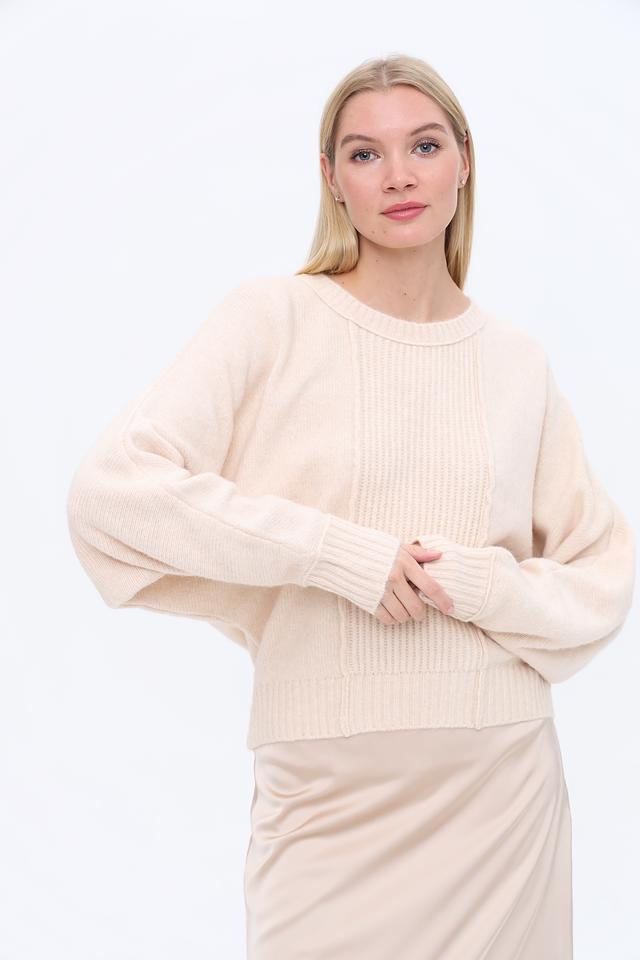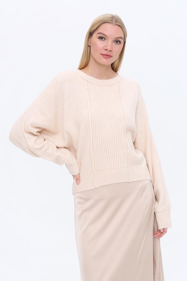 Особенностью модели является текстурная вставка на передней части, выполненная в рубчик, что добавляет изделию визуальный интерес. Пуловер имеет округлый вырез горловины и длинные рукава с манжетами.