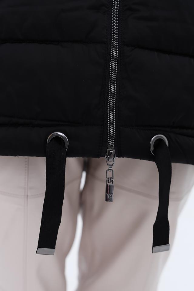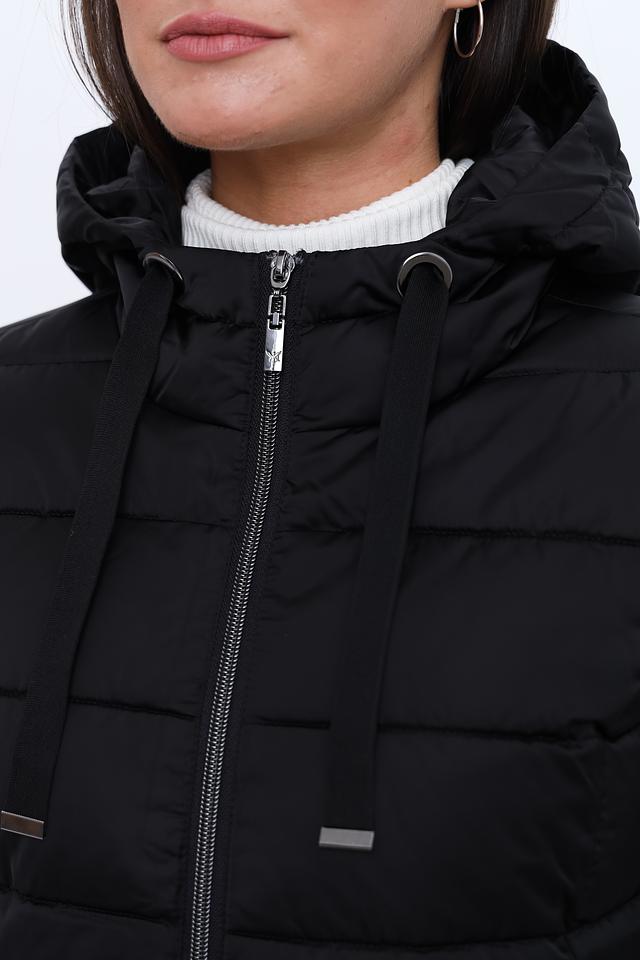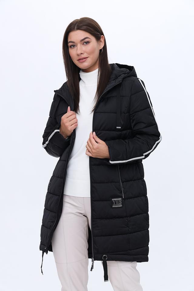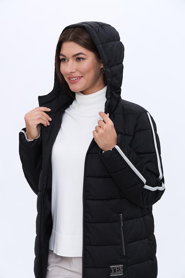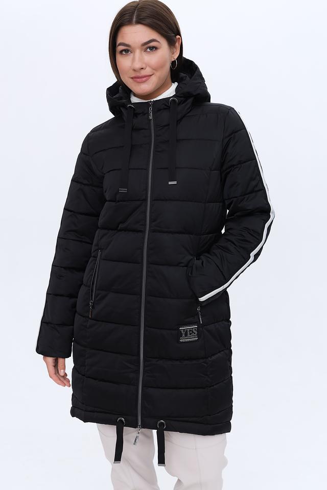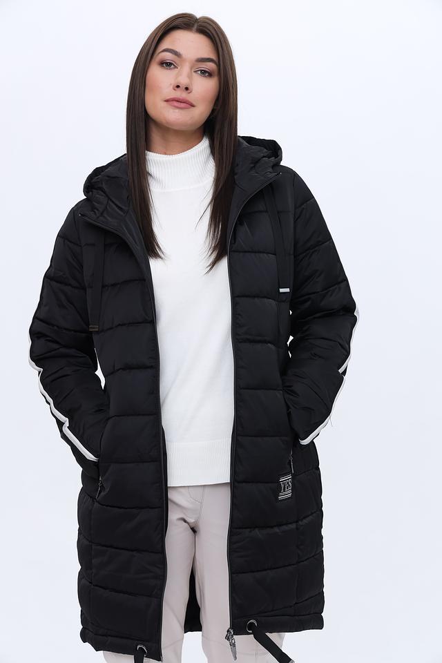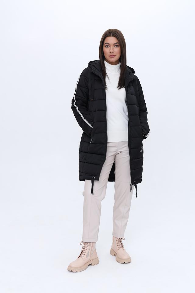 Чёрное стеганое пальто Monari – это стильное и практичное решение для прохладной погоды. Модель с капюшоном и боковыми карманами, украшенными белыми полосами, добавит динамики вашему образу. Состав: полиэстер 100%