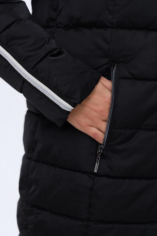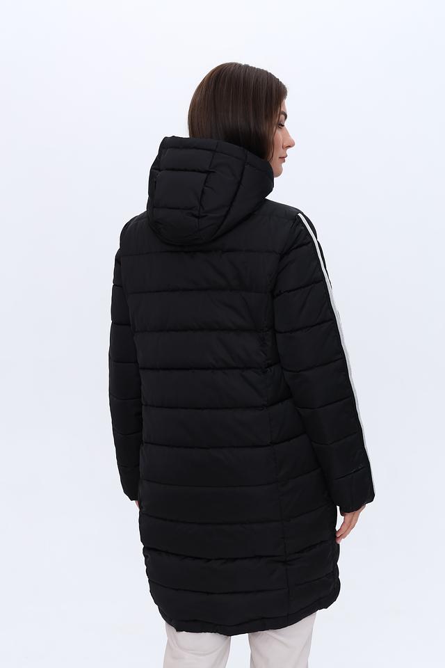Пальто имеет удобный капюшон, который защитит от ветра и непогоды. Боковые карманы не только функциональны, но и украшены контрастными белыми полосами, добавляющими динамики и стиля.