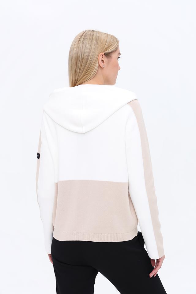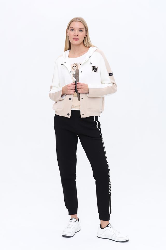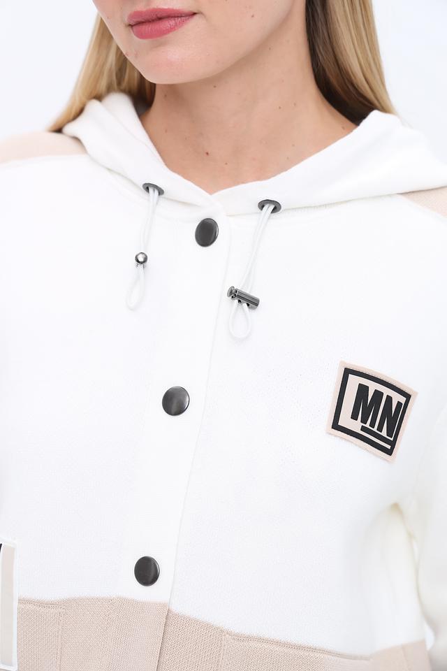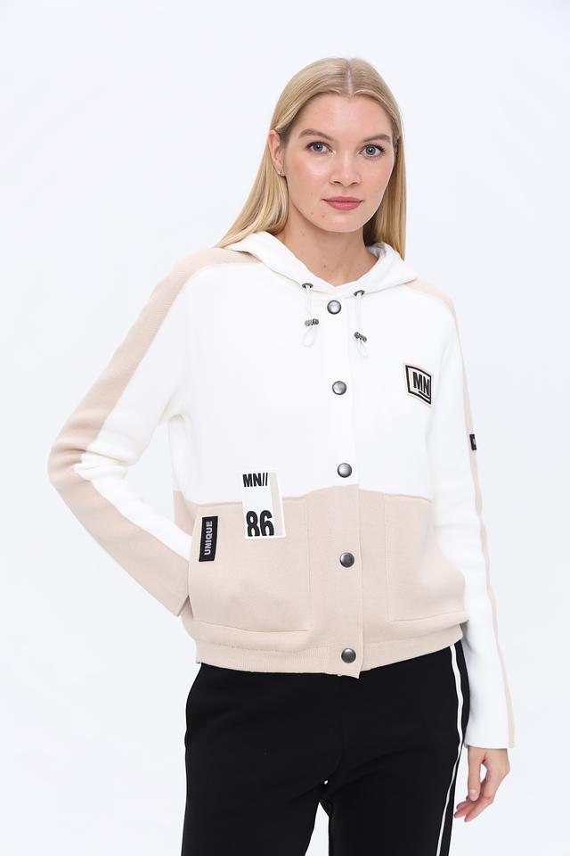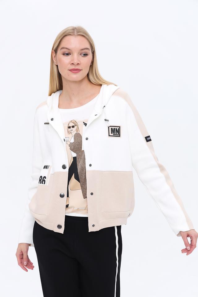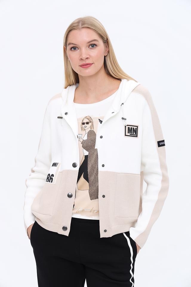 Жакет Monari бежевого и белого цвета с оригинальным принтом – стильное решение для создания яркого образа. Модель выполнена из мягкого трикотажа с капюшоном и застежкой на кнопки. Состав: хлопок 98%, полиамид 2%