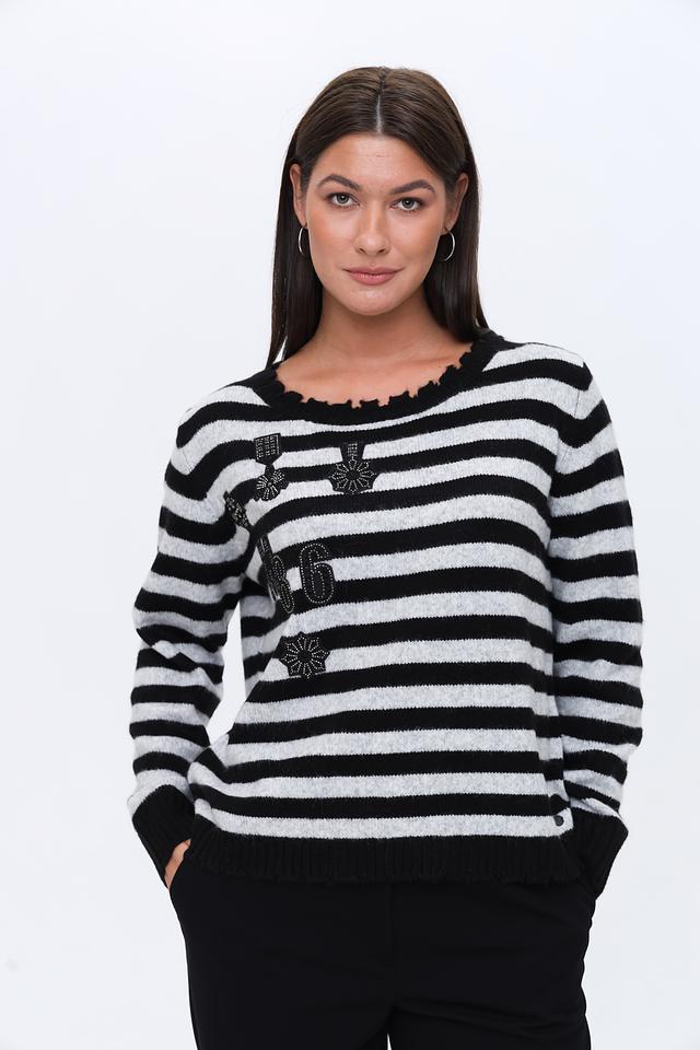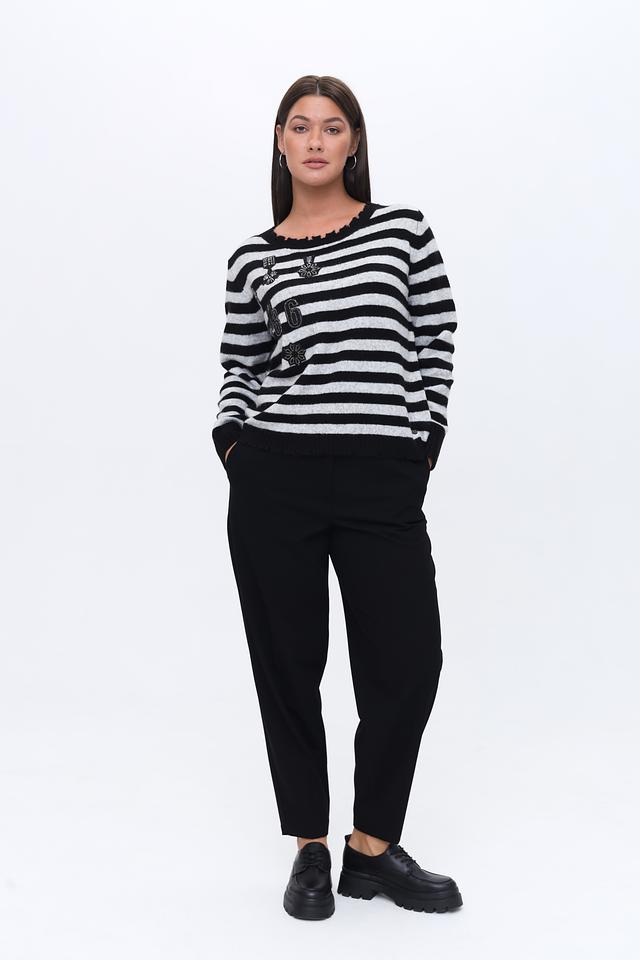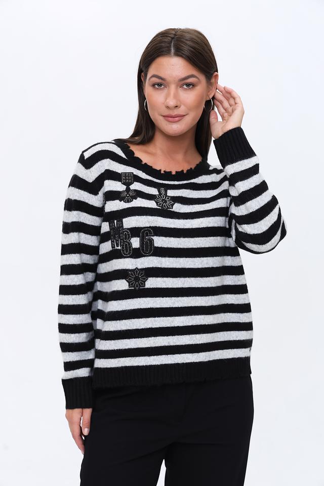 Женский пуловер Monari чёрно-белого цвета с полосатым узором и декоративной отделкой в виде цифр и цветочных элементов. Модель выполнена из мягкого трикотажа с добавлением шерсти для комфорта и тепла. Состав: полиакрил 55%, полиамид 40%, шерсть 5%
