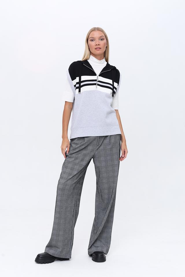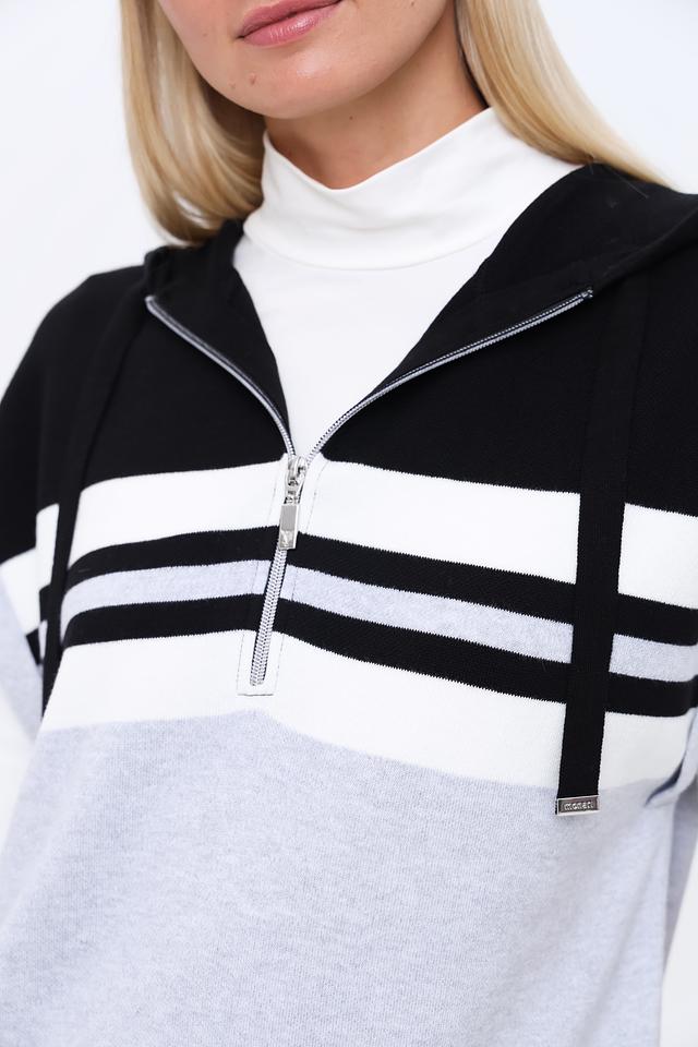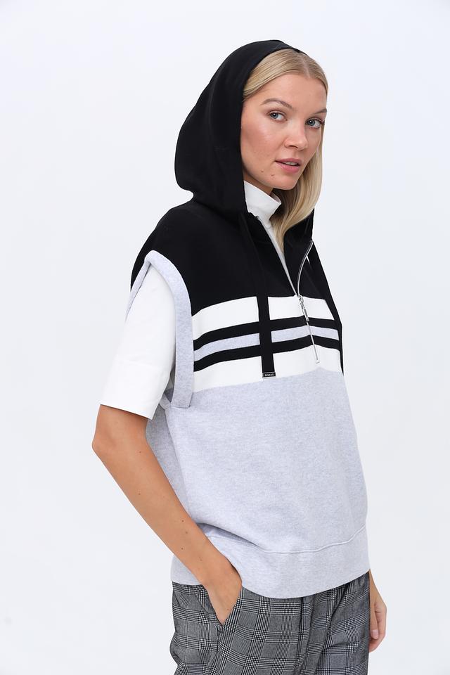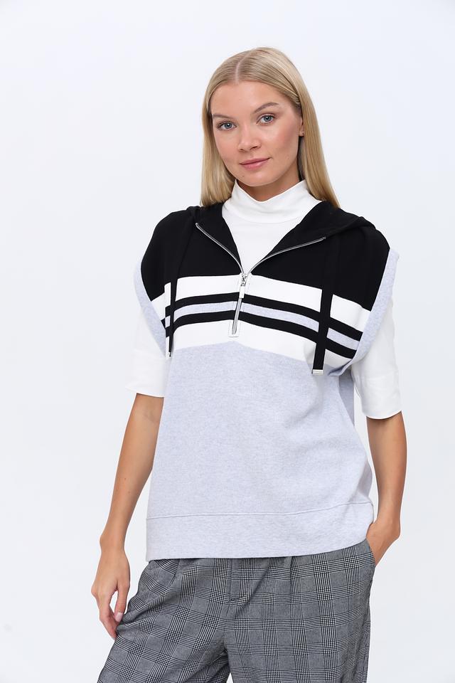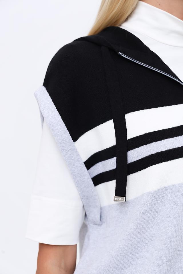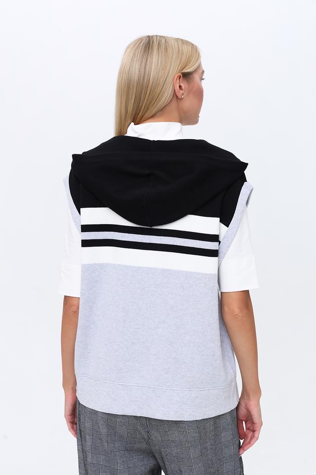 Стильный жилет Monari серого, белого и чёрного цветов с контрастными полосками и молнией. Модель без рукавов с капюшоном, идеально дополнит современный образ. Состав: хлопок 98%, полиамид 2%