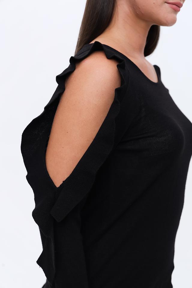 Рукава пуловера имеют оригинальную форму с воланами, добавляющими изюминку и делающими силуэт более интересным. Круглый вырез горловины подчеркивает линию шеи и позволяет сочетать пуловер с различными аксессуарами.
