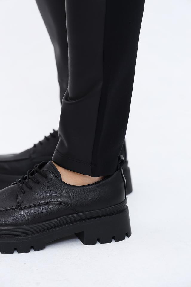 Брюки изготовлены из высококачественной эко-кожи, которая выглядит элегантно и обеспечивает комфорт при носке. Состав ткани включает 75% вискозы, 20% полиамида и 5% эластана, что придает брюкам мягкость, эластичность и приятные тактильные ощущения.