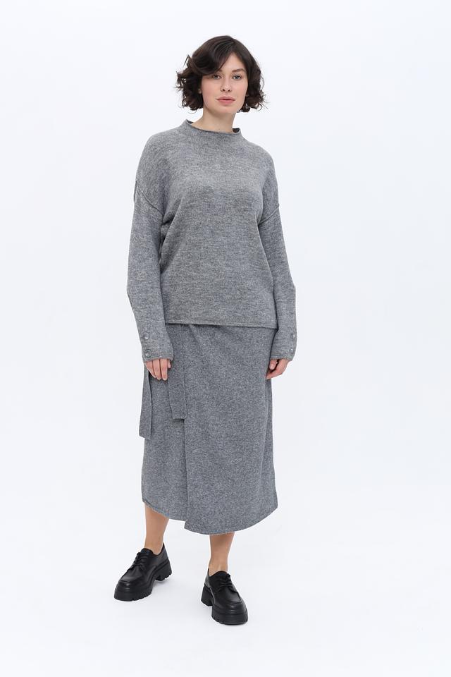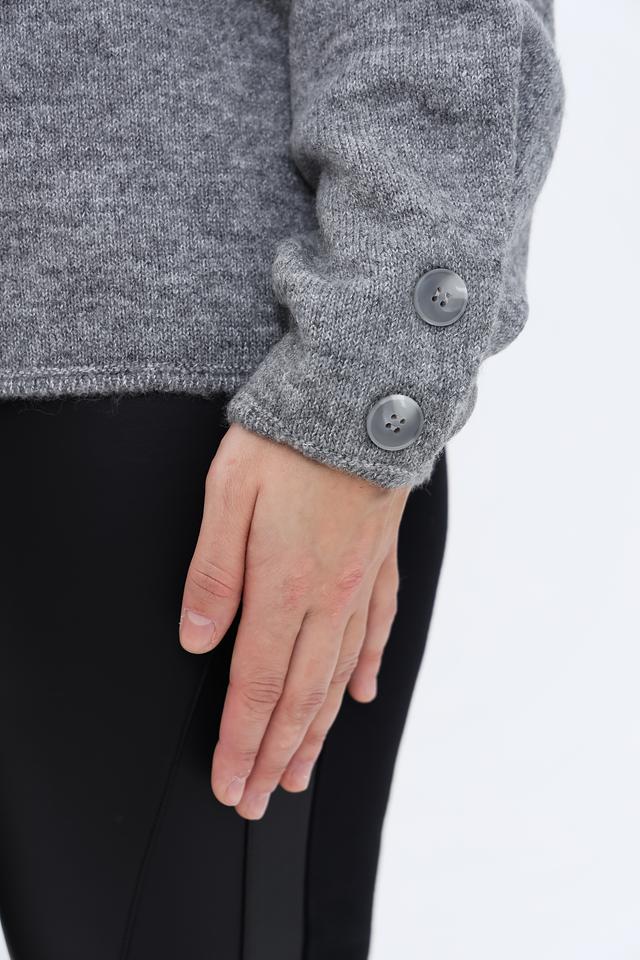 Пуловер имеет круглый вырез горловины и длинные рукава, которые заканчиваются манжетами с декоративными пуговицами. Текстура вязки придает изделию объем и визуальный интерес.