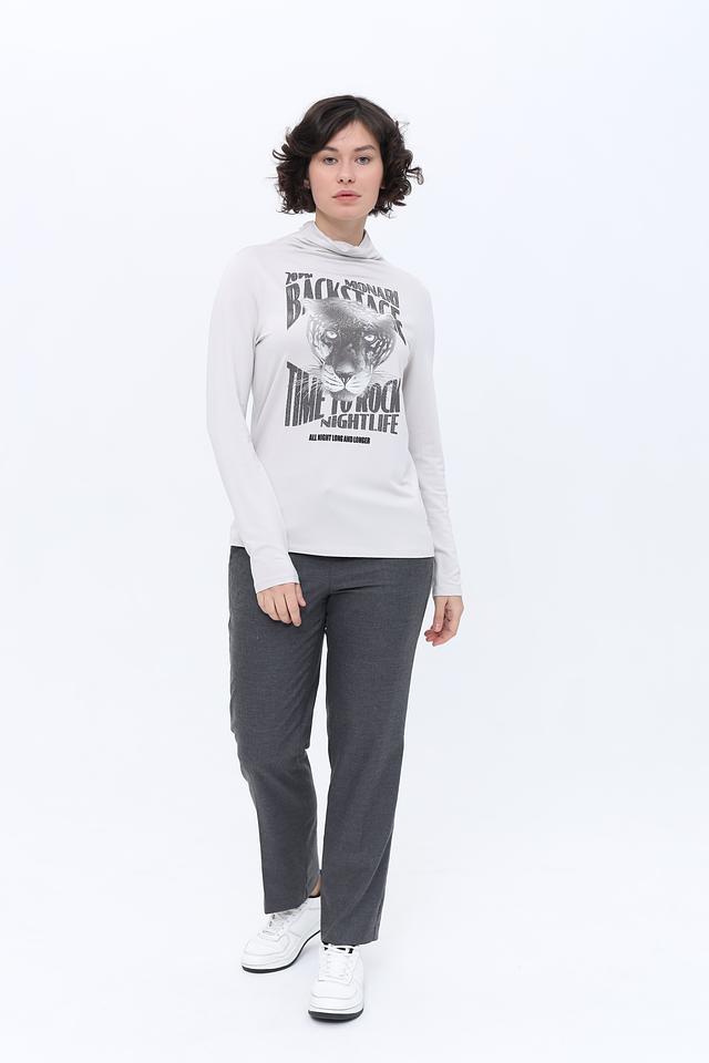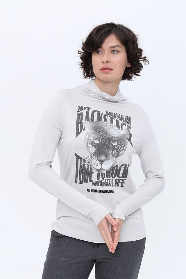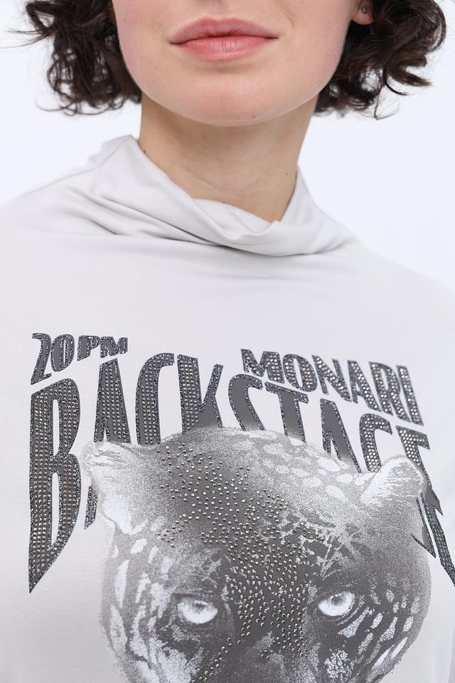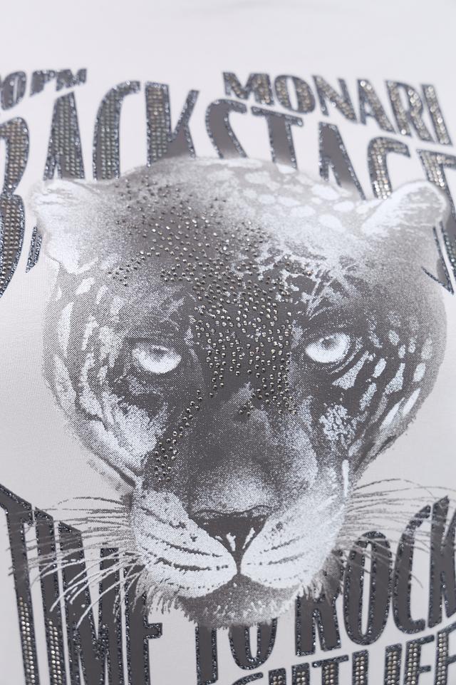 Этот стильный пуловер от Monari выполнен в светло-сером цвете и украшен крупным принтом тигра. Модель имеет удобный воротник-стойку и длинные рукава, что делает ее идеальным выбором для прохладной погоды.