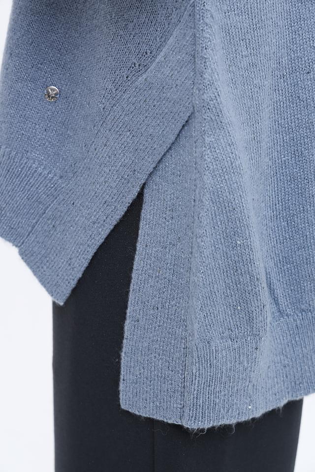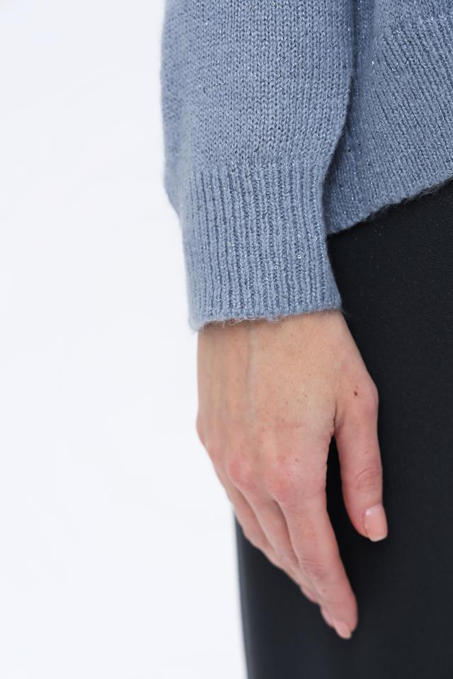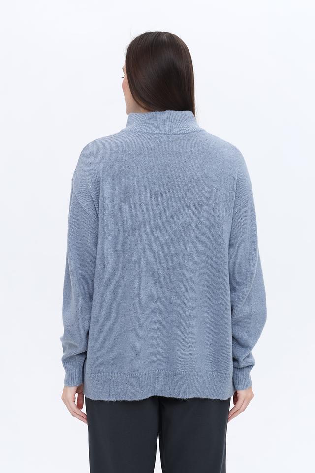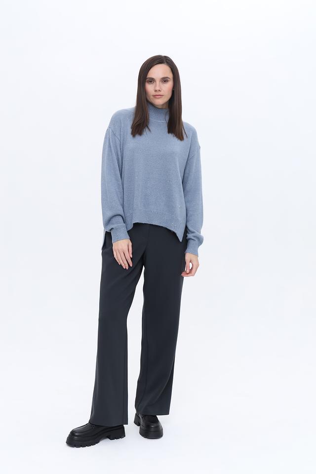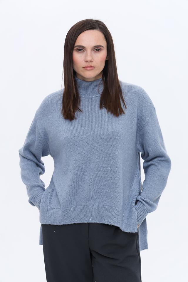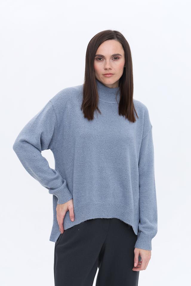 Пуловер имеет свободный крой, который обеспечивает комфорт в носке, а высокий горл придаёт ему элегантность. Голубой цвет изделия делает его универсальным и легко сочетаемым с другими элементами одежды.