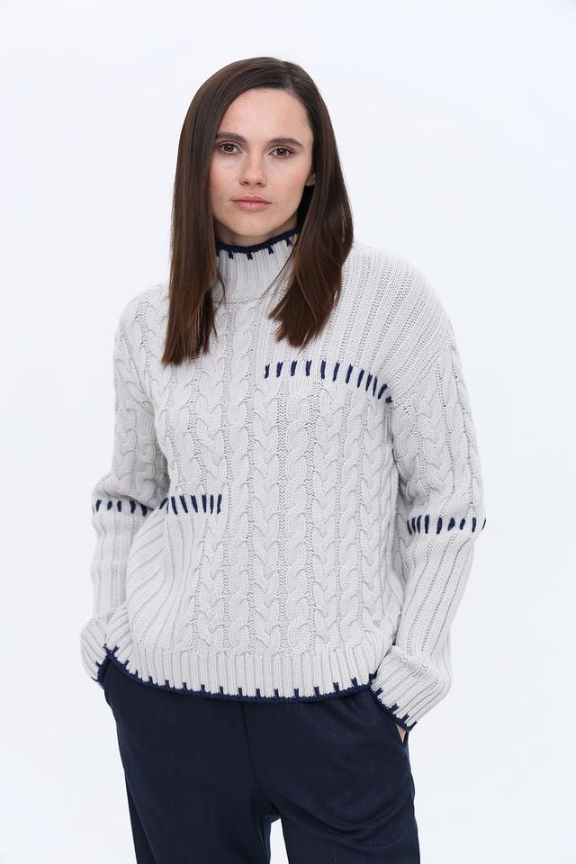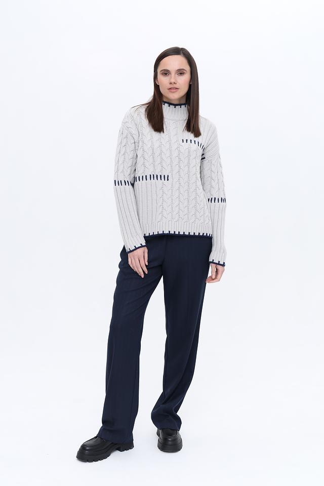 Этот пуловер от Monari выполнен в светло-сером цвете и отличается выразительным узором "косы". Модель имеет удобный крой и слегка завышенную горловину, отделанную контрастной синей вязкой.