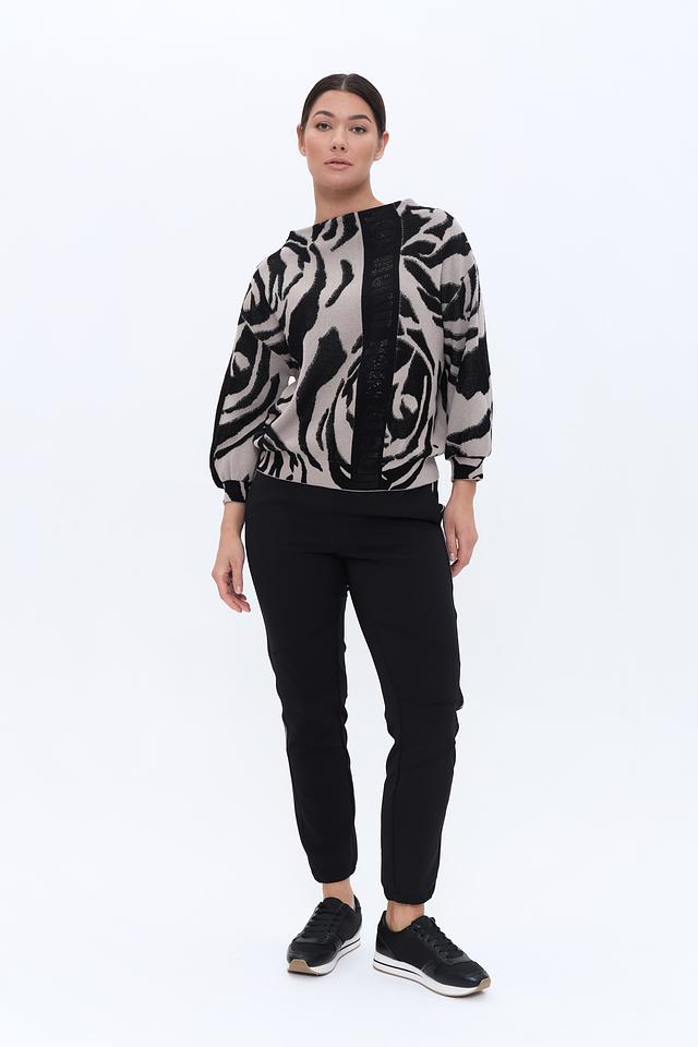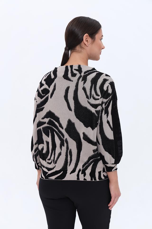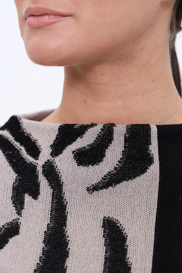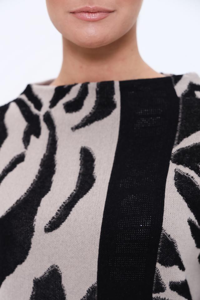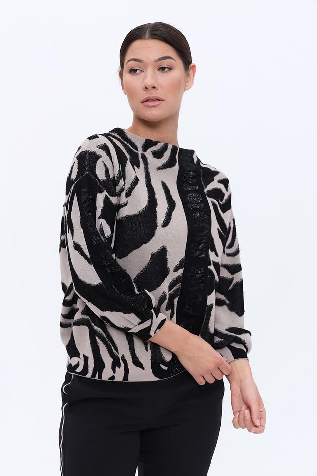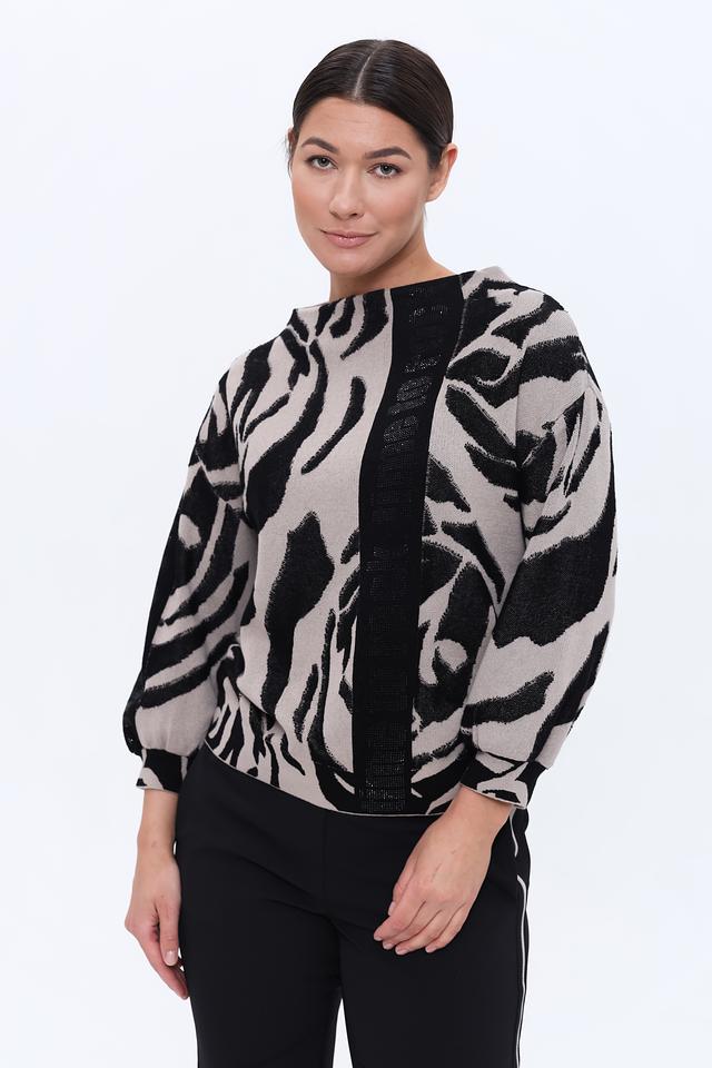 Особенностью данного пуловера является его уникальный принт в виде "зебры", сочетающий в себе оттенки бежевого и чёрного. Такой рисунок добавляет изделию оригинальности и позволяет выделиться из толпы.
