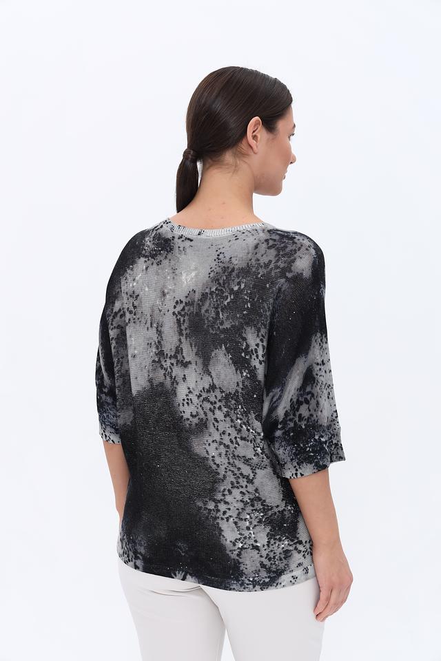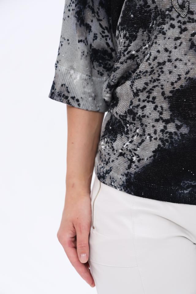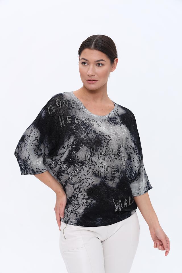 Женский пуловер Monari чёрно-белого цвета с оригинальным принтом и надписями. Модель свободного кроя с рукавами 3/4 выполнена из мягкого хлопкового трикотажа, что обеспечивает комфорт в носке. Состав: хлопок 85%, полиэстер 15%