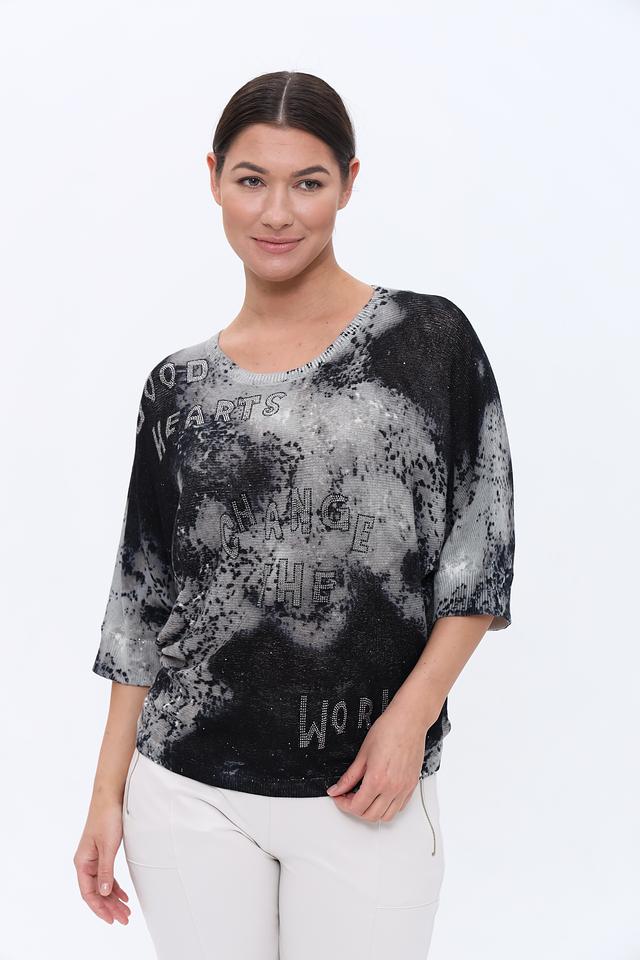 Этот стильный пуловер от Monari станет ярким акцентом вашего образа. Модель выполнена в чёрно-белой гамме с эффектным принтом, включающим надписи "Good Hearts Change The World".