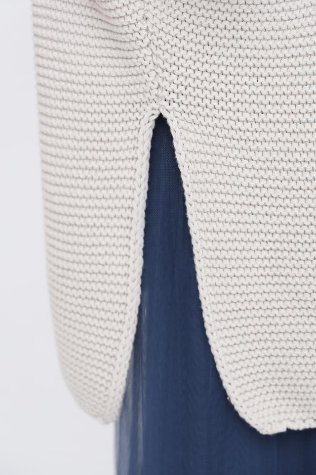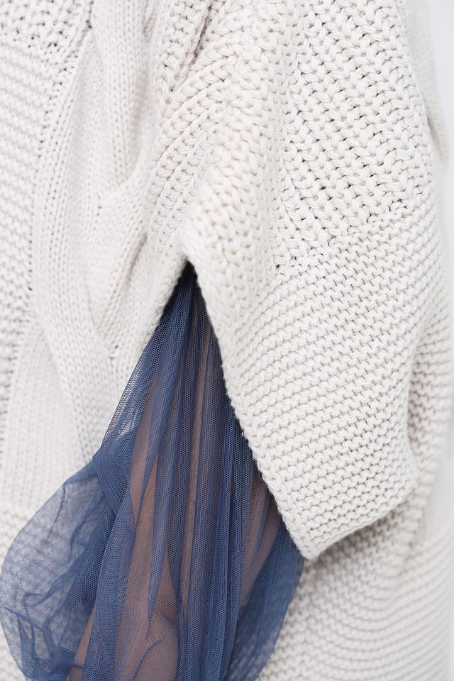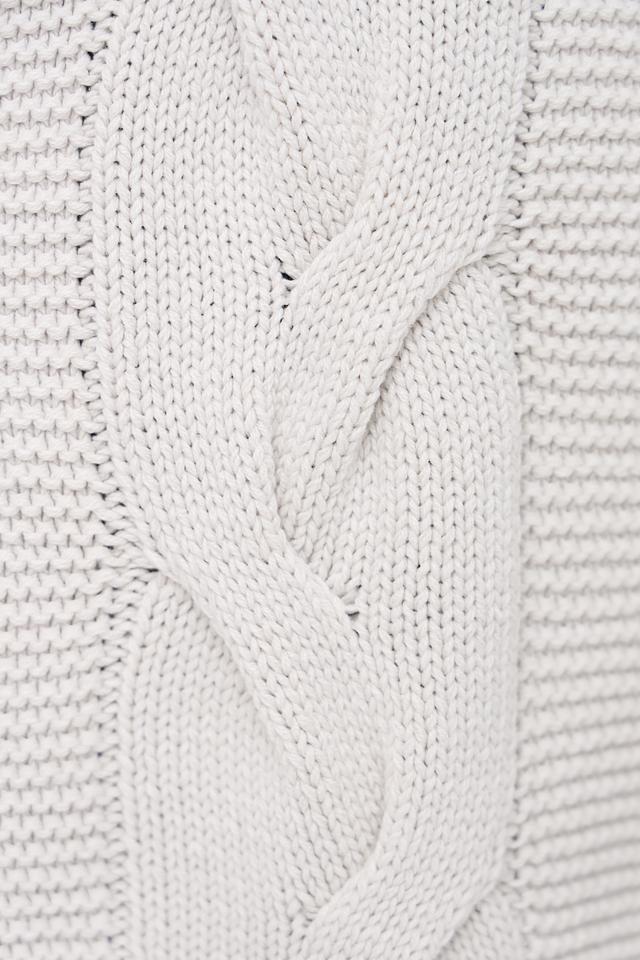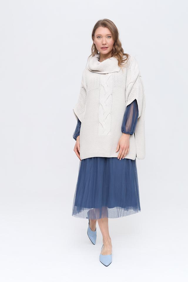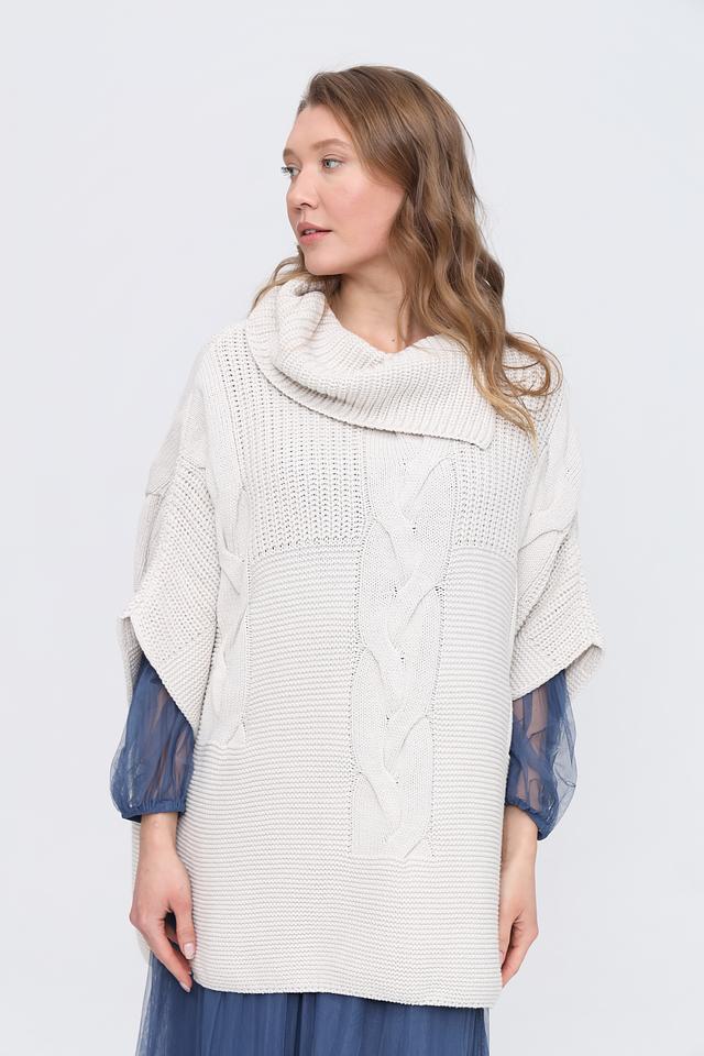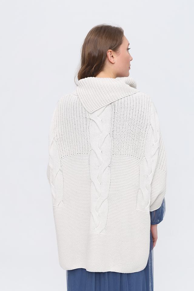 Пуловер имеет свободный крой, высокий воротник и выразительный узор из кос на передней части. Рукава широкие, слегка расклешенные к низу, что придает изделию воздушность и легкость. Спинка также украшена косами, добавляя пуловеру текстуру и объем.