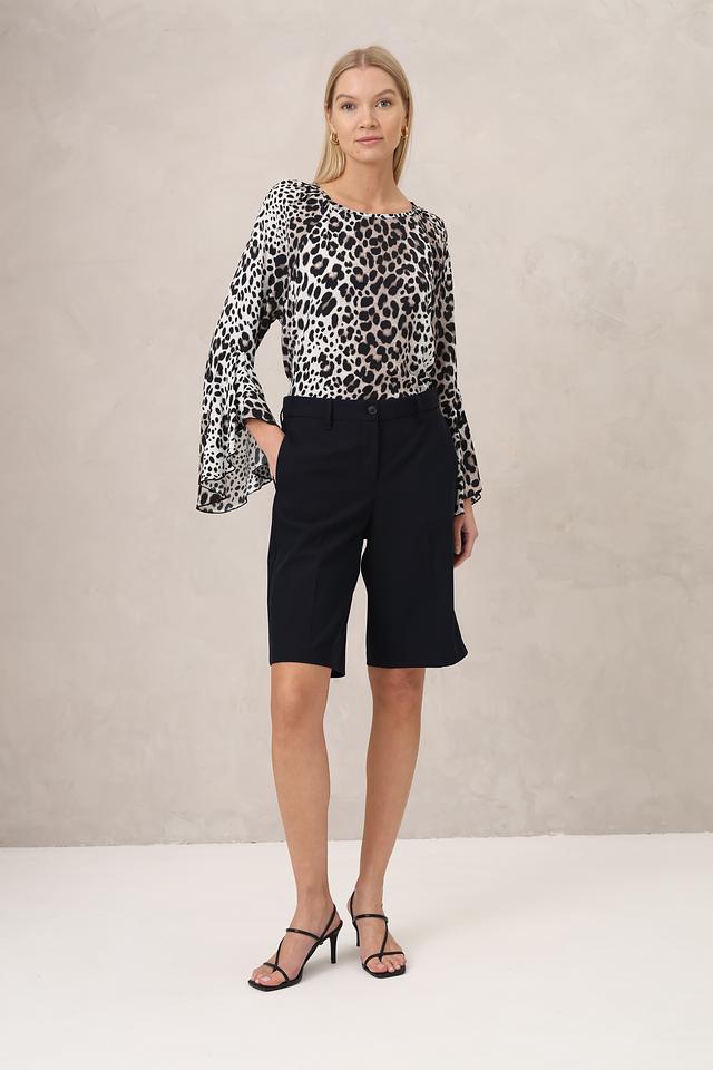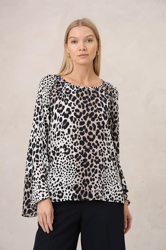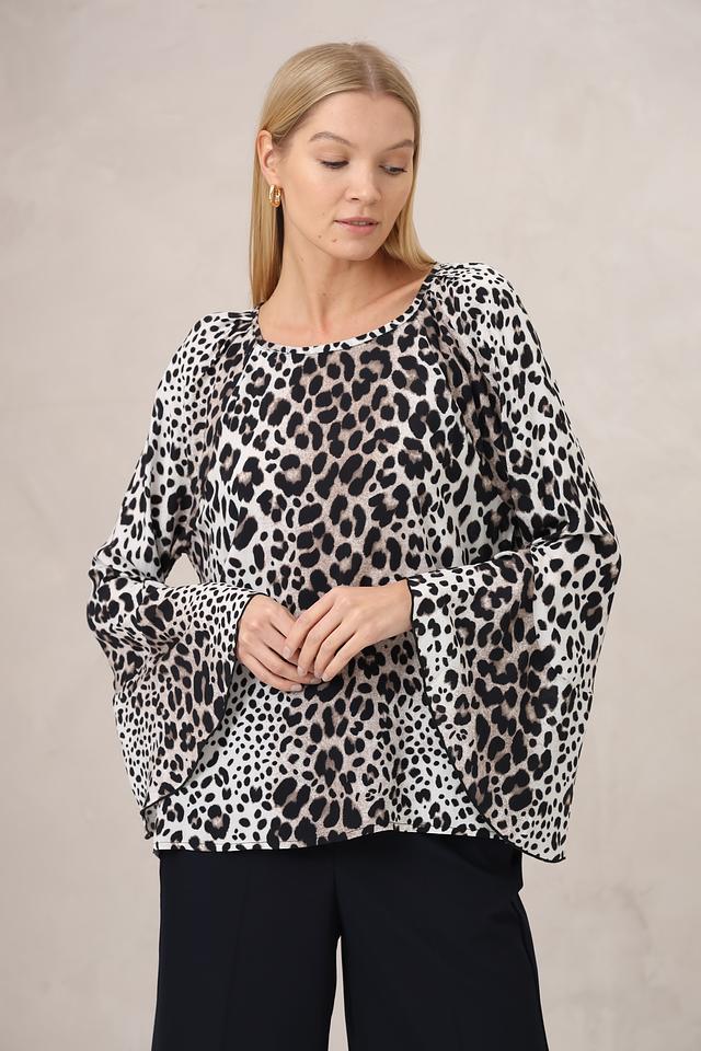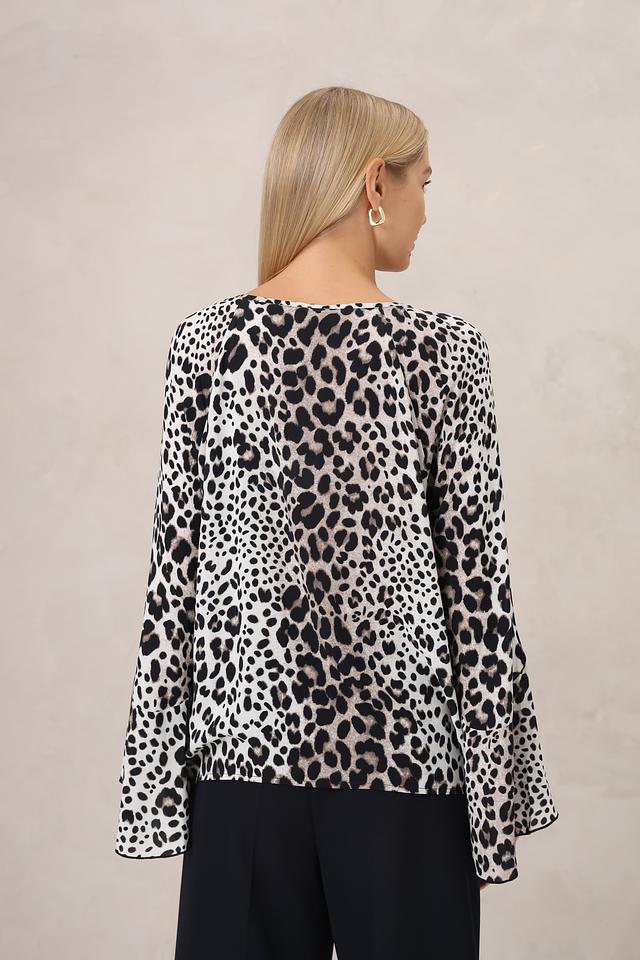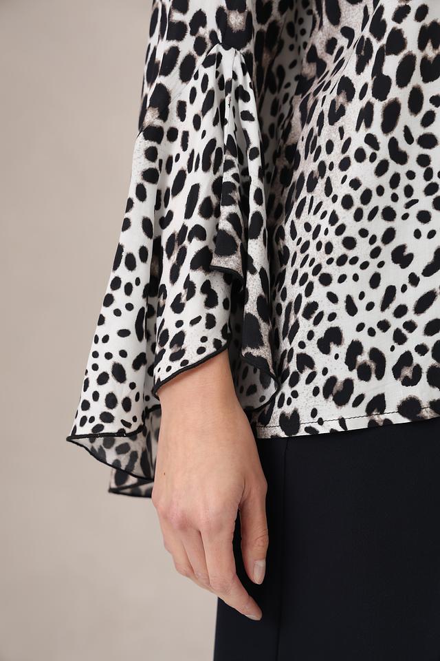 Основной цвет блузы – белый, но ее главным украшением является яркий леопардовый принт, который придает ей индивидуальность и выразительность. Рукава блузы – колокол, что добавляет образу романтичности и легкости.