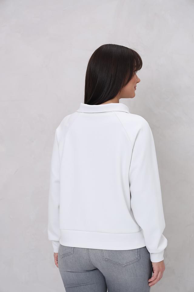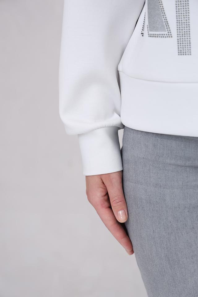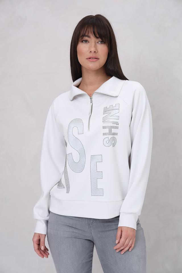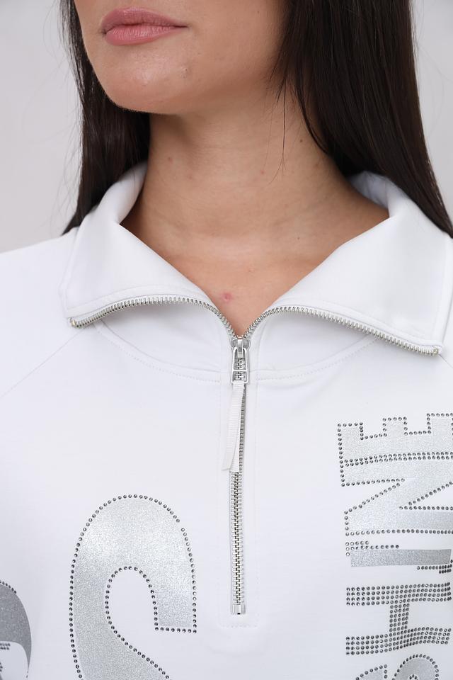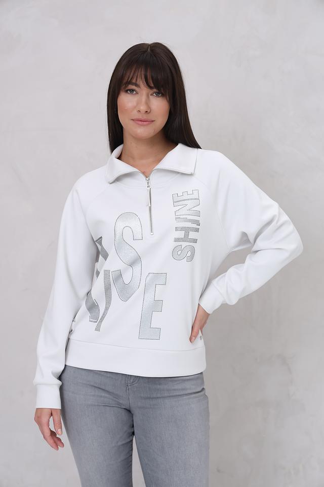 Белый пуловер Monari с коротким молниями и декором из блесток – стильное и комфортное решение для повседневного образа. Модель выполнена из мягкого трикотажа с добавлением вискозы и эластана, обеспечивающего удобную посадку. Состав: полиэстер 55%, вискоза 38%, эластан 7%