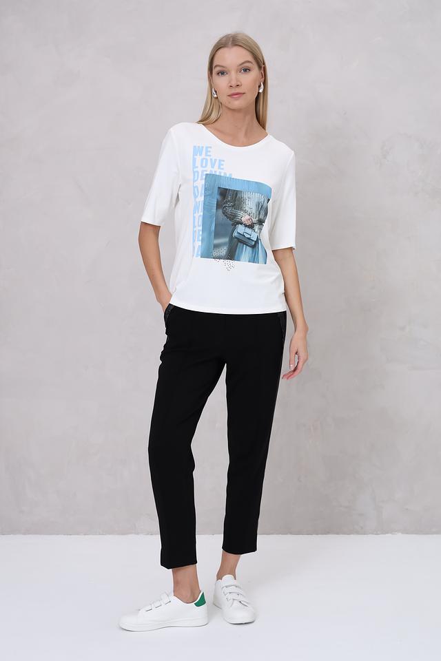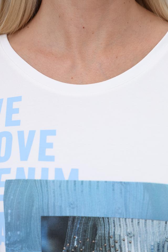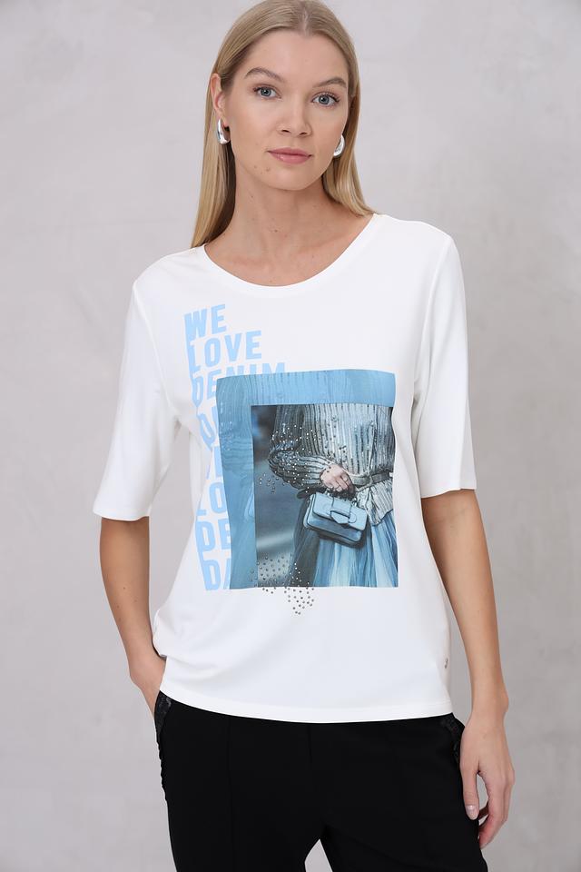 Эта футболка от Monari – идеальный выбор для создания непринужденного, но стильного образа. Футболка выполнена в белом цвете и украшена эффектным принтом с изображением сумочки и надписью "WE LOVE DENIM" в голубых оттенках.