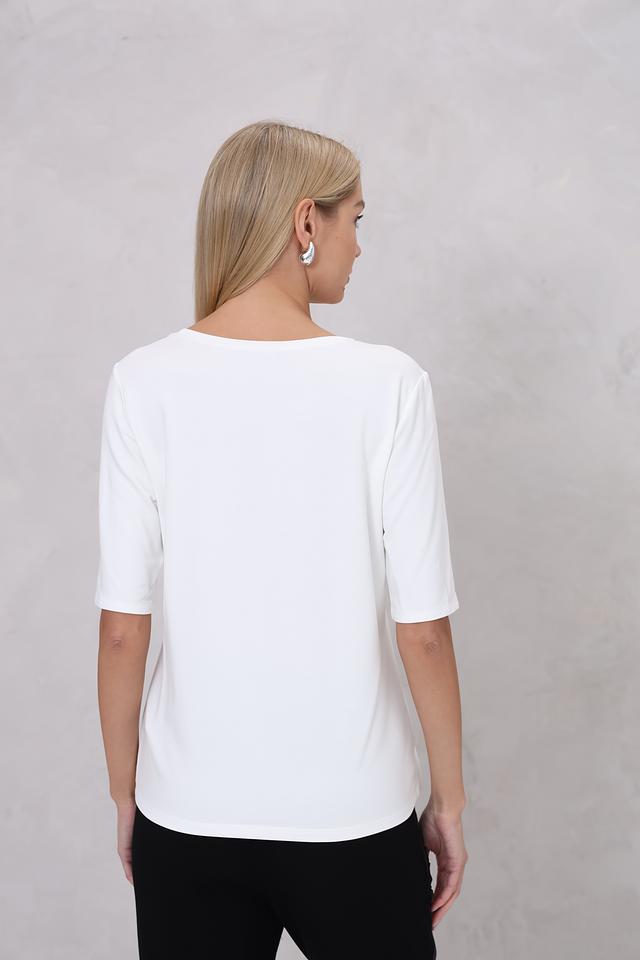 Модель имеет прямой крой, короткие рукава и круглый вырез горловины. Футболка изготовлена из высококачественного трикотажа, в составе которого вискоза, модал и эластан, что обеспечивает мягкость, комфорт и хорошую посадку по фигуре.