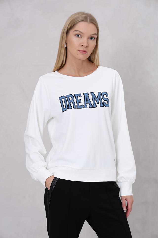 Этот стильный пуловер от Monari выполнен в белом цвете и украшен эффектной надписью "DREAMS" голубого оттенка. Модель имеет свободный крой и округлый вырез горловины, что делает ее универсальной и подходящей для различных образов.